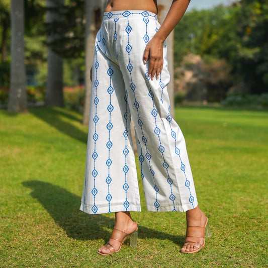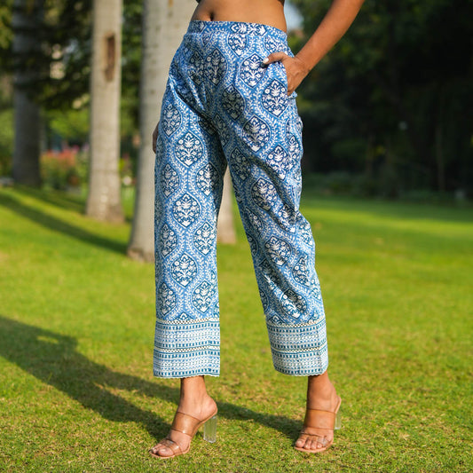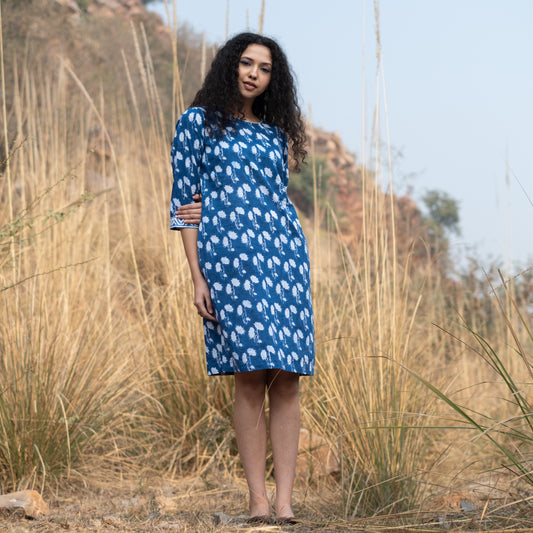 Indigo block printed knee length shift dress with three quarter sleeve and side pocket