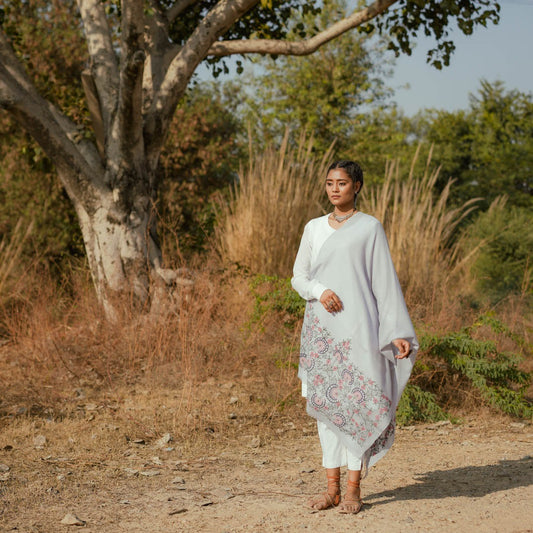 White Hand Block Printed Fit and Flare Kurta Set with Embroidered Waist Detail and Back Tie-up( set of 2 )