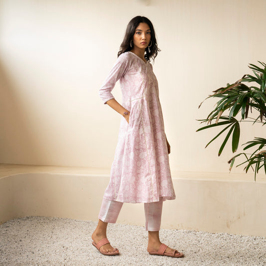 Blush pink block printed Anarkali kurta with embroidery detail neckline