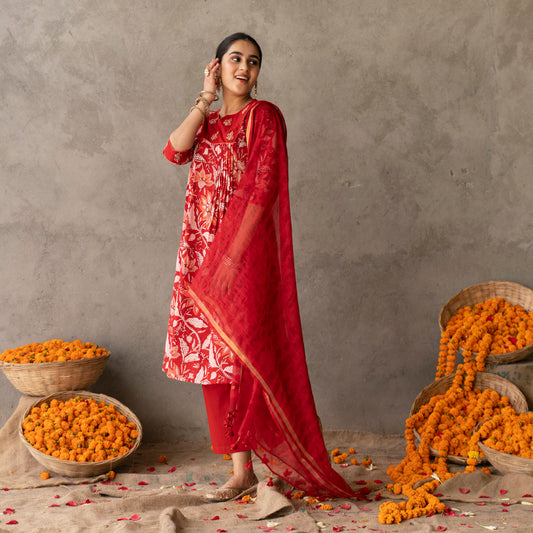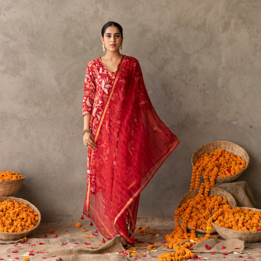 Red block printed pintuck detail with side slits kurta set with dupatta