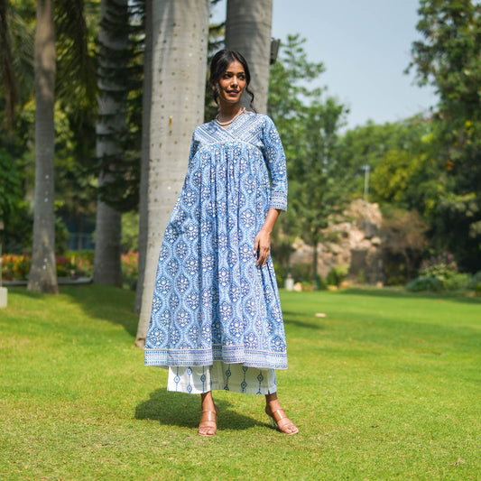 Blue Hand Block Printed Anarkali Kurta with Lace Yoke and Overlapped V-neck