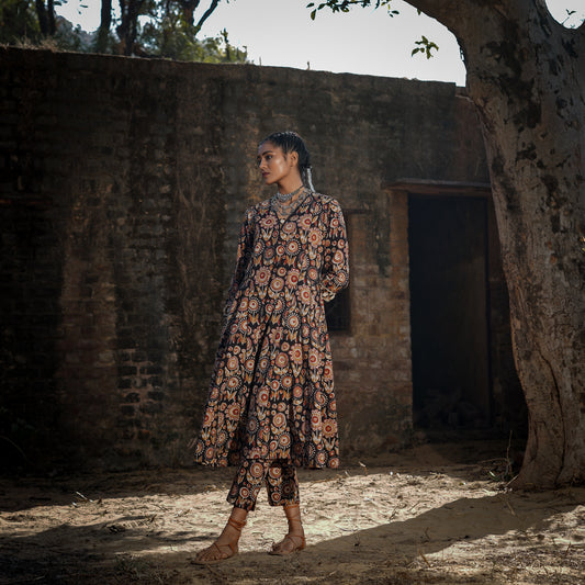 Black Block Printed Panelled Kurta With Embroidery Detail
