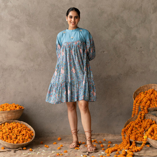 Blue short flared tiered dress with embroidery details