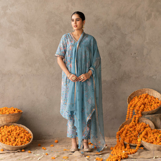 Blue block printed with yoke and sleeve detailed A line suit set with dupatta