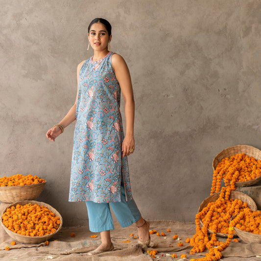 Blue block printed and embroidery detailed straight fit sleevless kurta with pants set