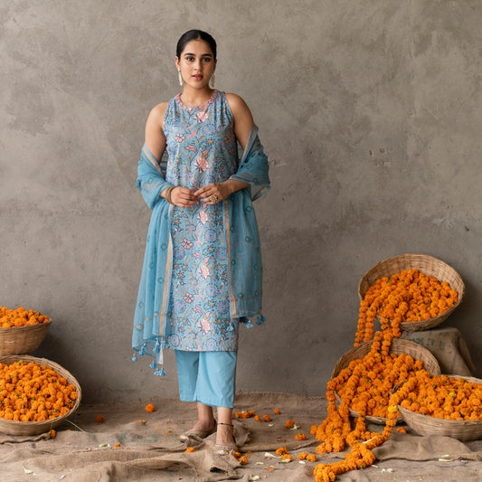 Blue block printed and embroidery detailed straight fit sleevless suit set with dupatta