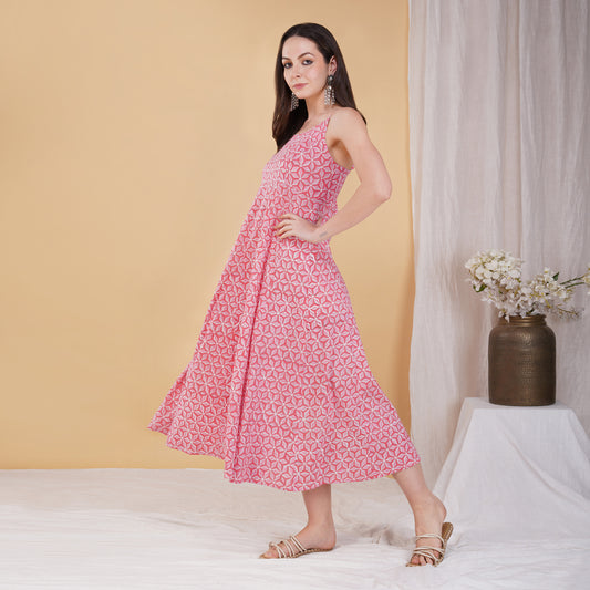 Pink Star Hand Block Printed Long A Line Sleeveless Dress