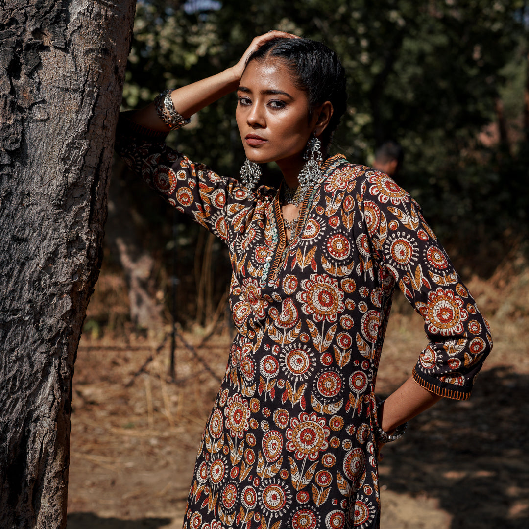 Indulge in the enchantment of this black block-printed kurta set adorned with hand-embroidered motifs on the yoke and sleeves. Meticulously crafted from 100% cotton, each piece echoes the raw beauty of Rajasthan's tribal landscape, drawing inspiration from the Indian Gypsy. Each piece tells a story of heritage and tradition, capturing the raw beauty of the desert landscape and the spirited energy of Indian gypsy communities
