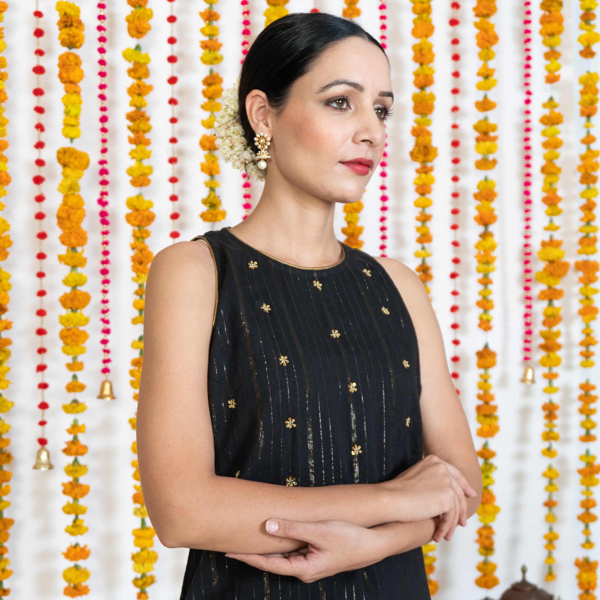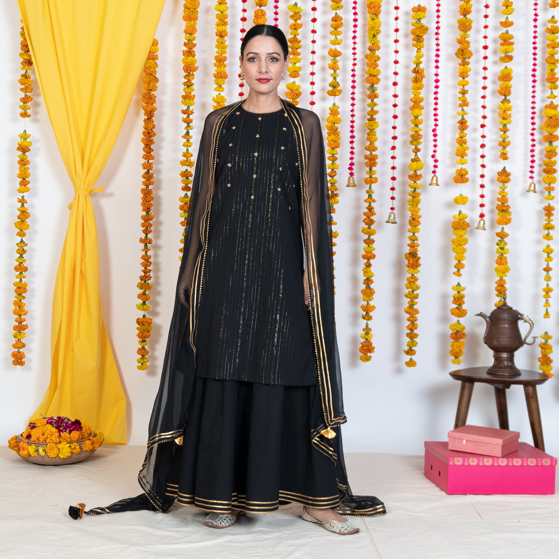 Black Round Neck, Sleeveless Embroidery Short Kurta Sharara Set With Dupatta (Set Of 3)