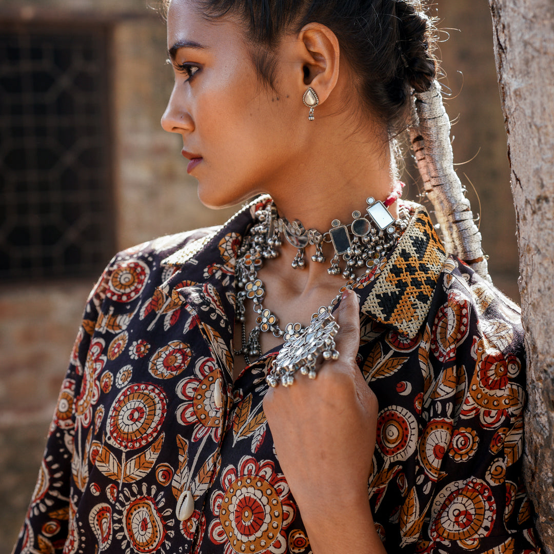 Explore the magic of our Black block-printed shirt style kurta with straight pant co-ord set from the 'Rait' collection. Adorned with hand-embroidered motif details on the collar, yoke and sleeves of the kurta, this meticulously crafted piece on 100% cotton is a celebration of elegance.