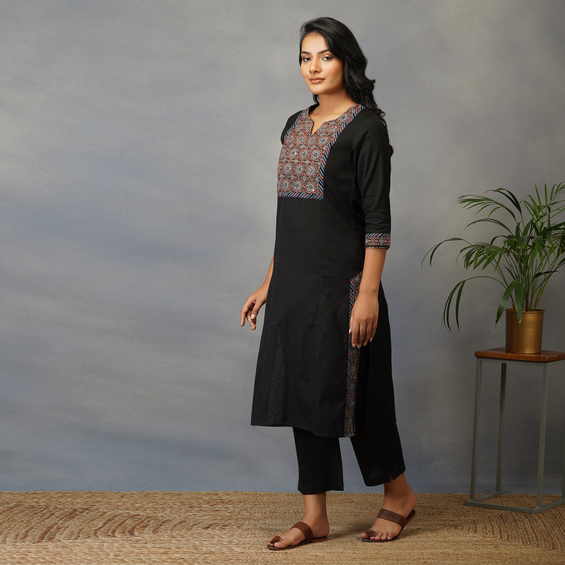 Black Straight Kurta with Ajrak Yoke in Zari Embroidery