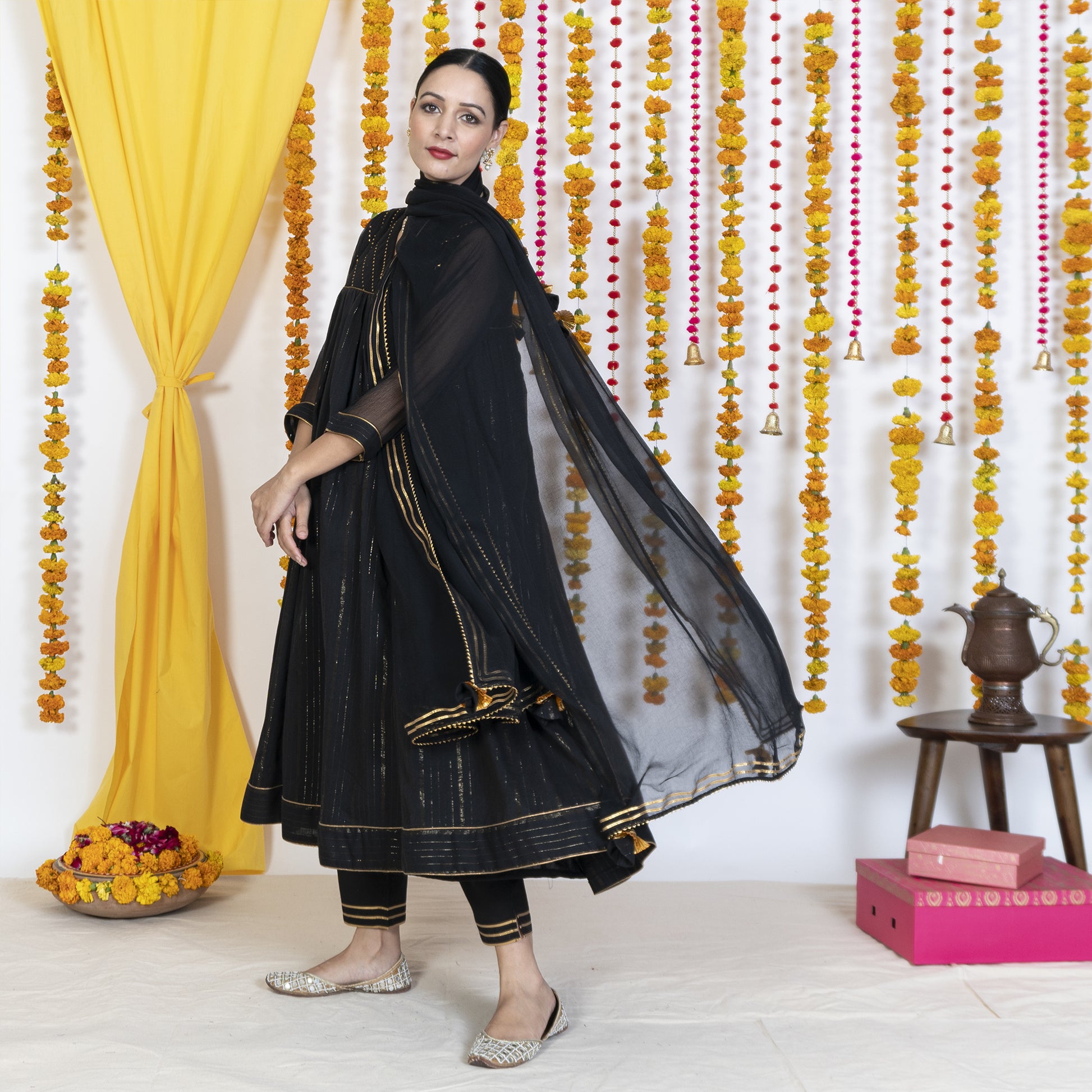 Black V Neck Embroidered Anarkali Kurta Set With Dupatta (Set Of 3)