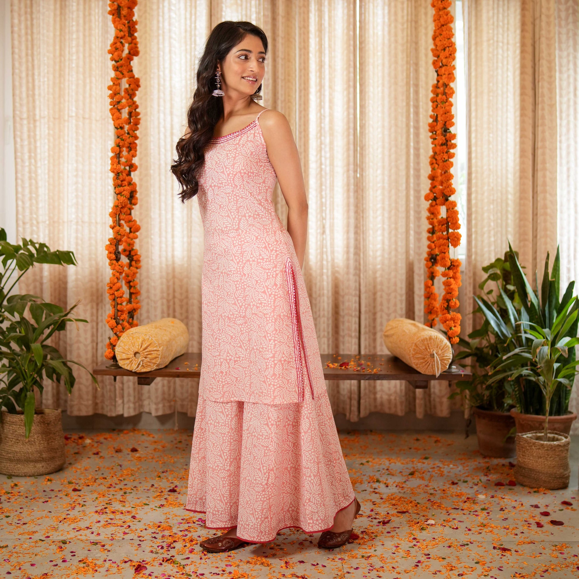 Elevate your style with this kurta from our Veera collection that perfectly combines refinement and artistry. Made entirely of cotton, this spaghetti strapped straight kurta in blossom pink hue with gota lace details ensures unmatched comfort and a classic elegance all at once. A must-have for festive grace, the tranquil blossom pink color gives a touch of classic charm to this kurta. A wardrobe must have that honours India's ageless craftsmanship of hand block printing, capturing the spirit of traditions.