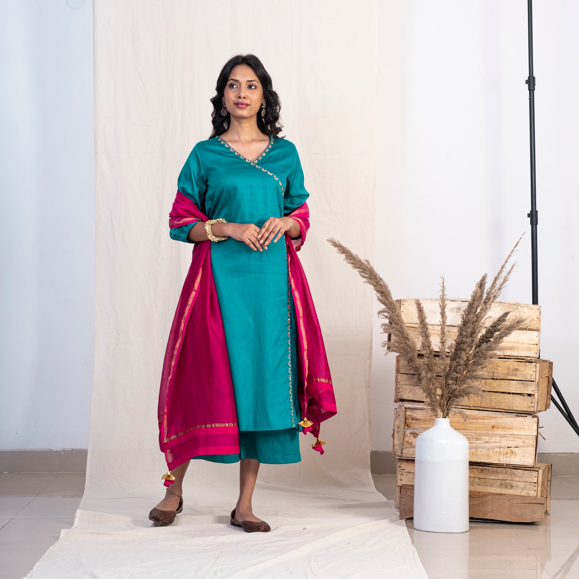 Blue Angrakha Embroided Kurta Set With Plazzo and Pink Dupatta