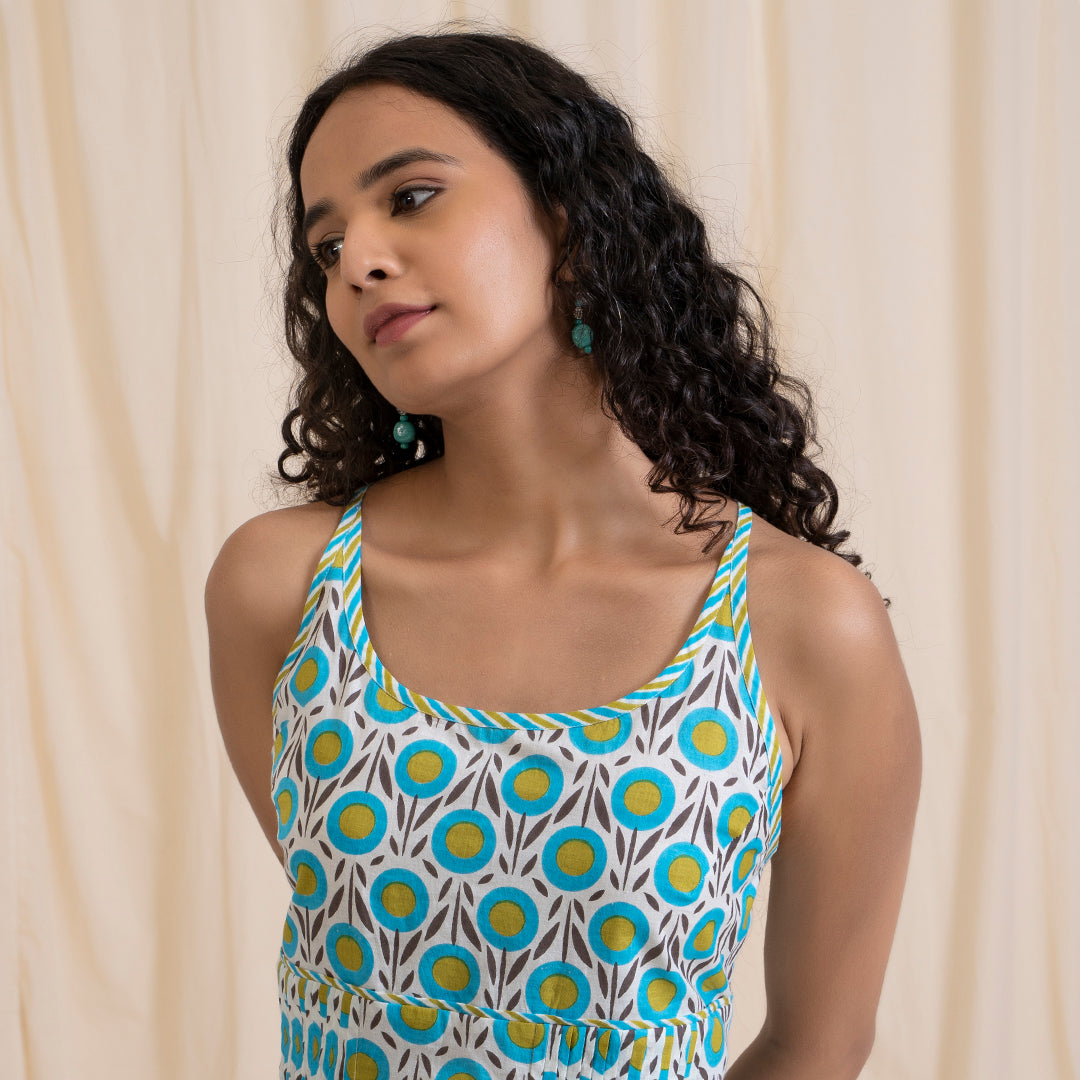 This comfy and cute top features a blue and green print, spaghetti straps, and a great fit. Made in 100% cotton with intricate detailing in stitching its ideal for pairing with a skirt, culottes or jeans. It's perfect for a casual summer day!