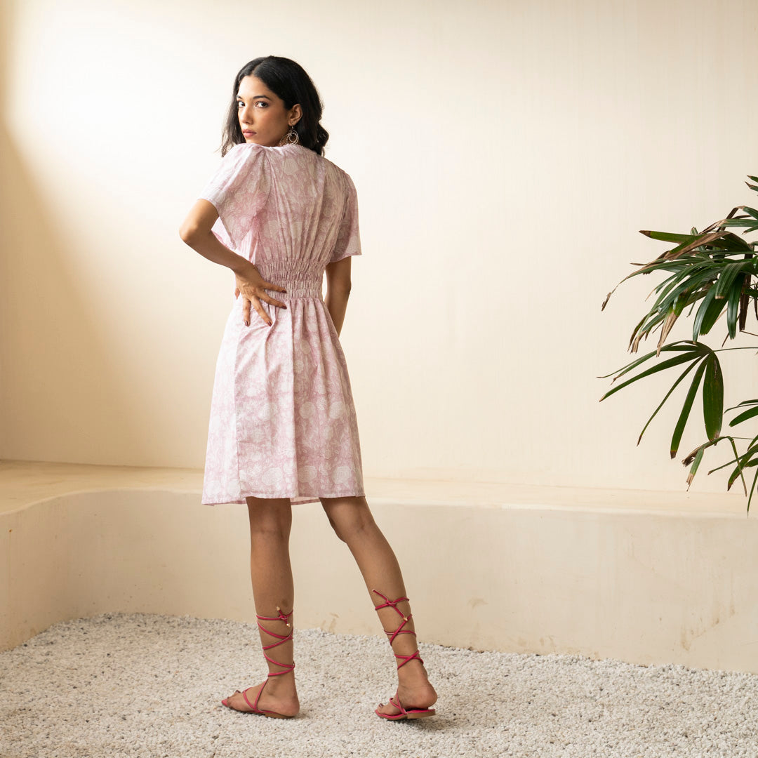 Blush Pink block printed box pleat dress V neck and relaxed sleeves with side pockets