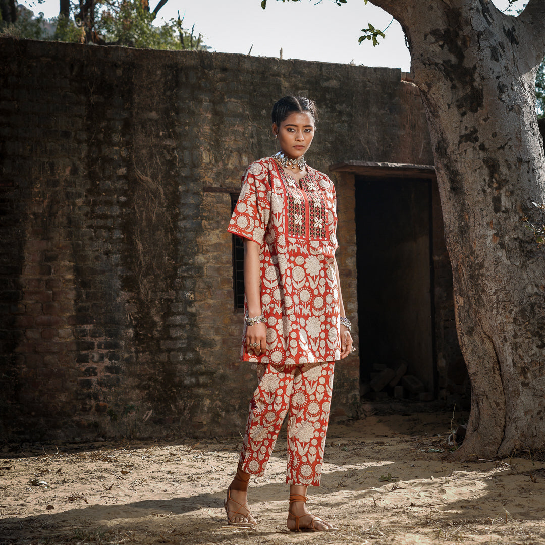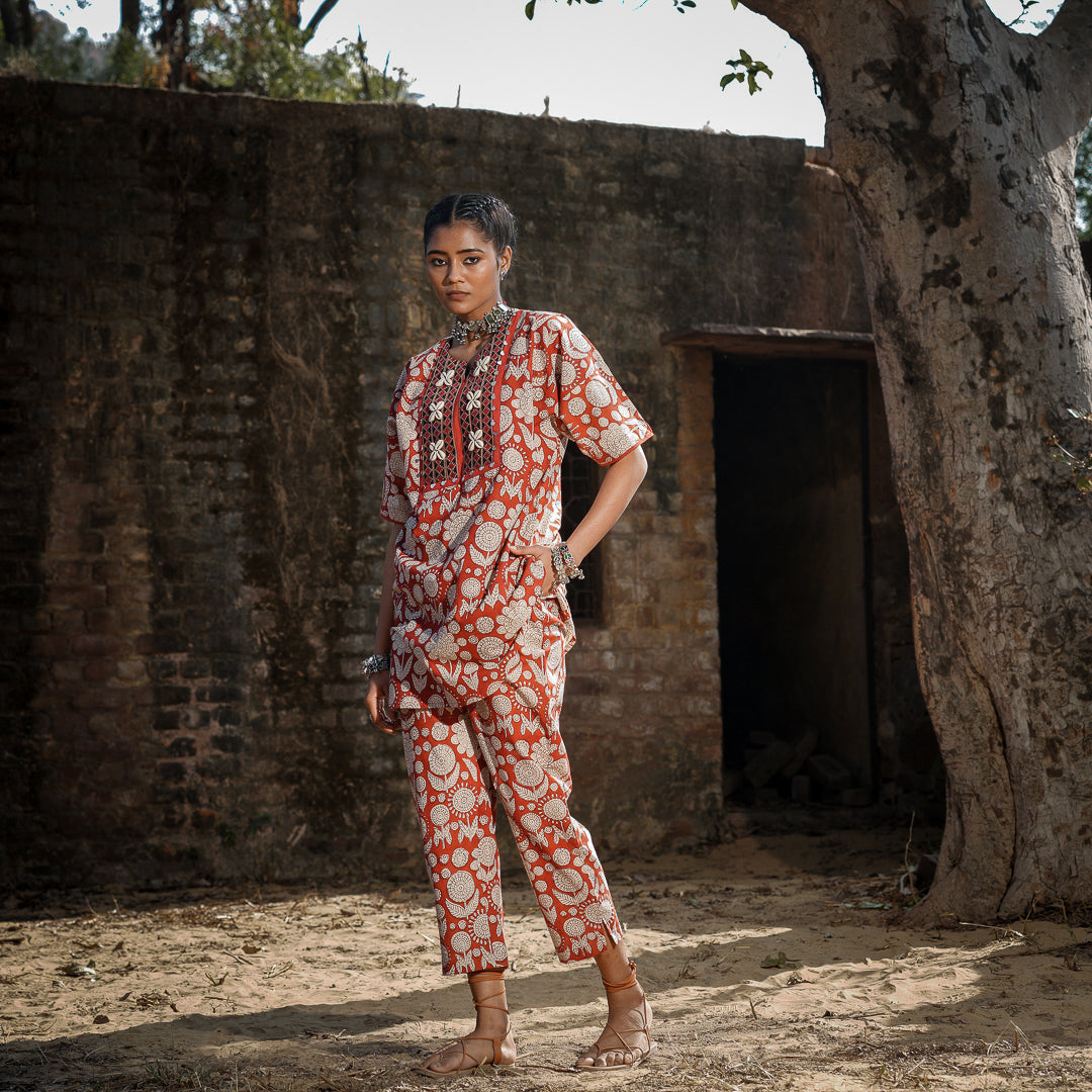 'Rait,' a celebration of timeless elegance and charm. Immerse yourself in the beauty of our Brick Red block-printed shirt-style kurta paired with straight pants co-ord set, adorned with hand-embroidered motif details on the yoke. Meticulously crafted from 100% cotton, each piece in the collection draws inspiration from the tribals of Rajasthan, the Indian Gypsy.