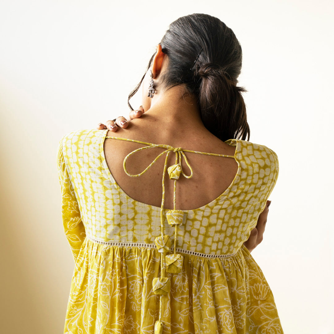 Chartreuse green block printed Anarkali kurta with V Neck with pleat detail neckline with Shibori tie dye trousers