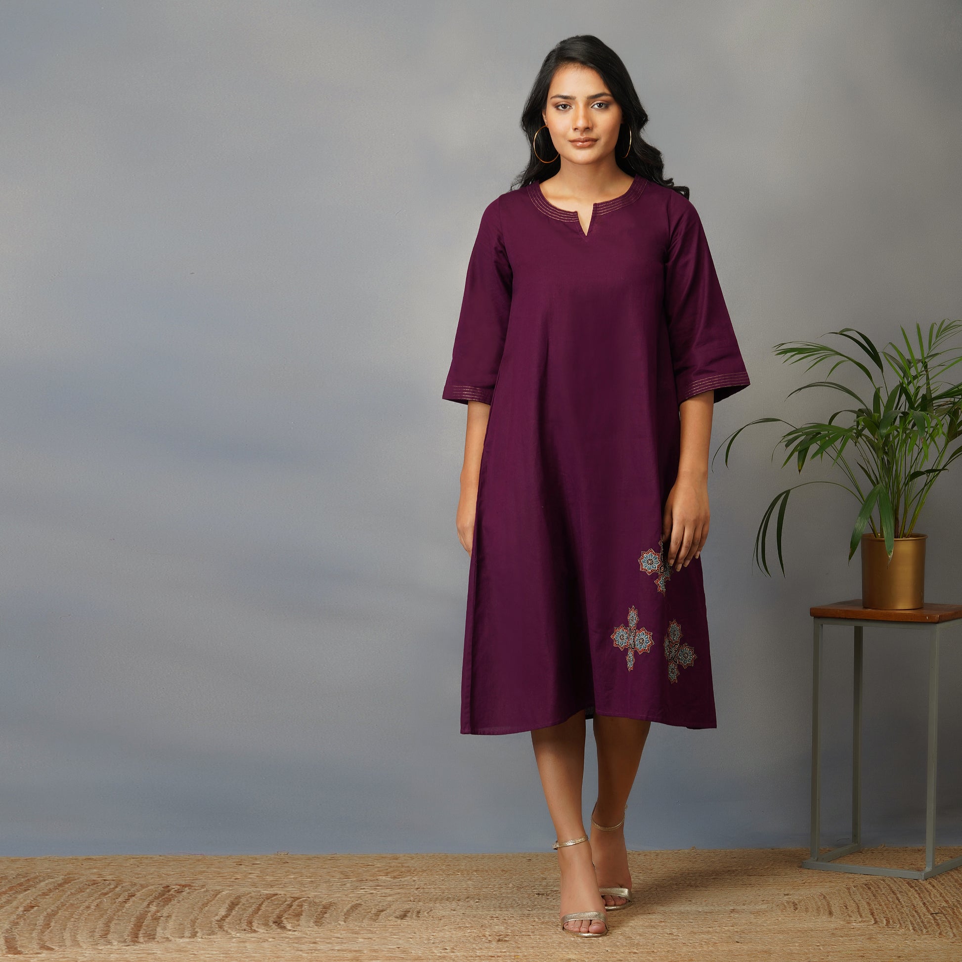 Mulberry (Purple) A Line Dress with Handblock Ajrak Patch Work