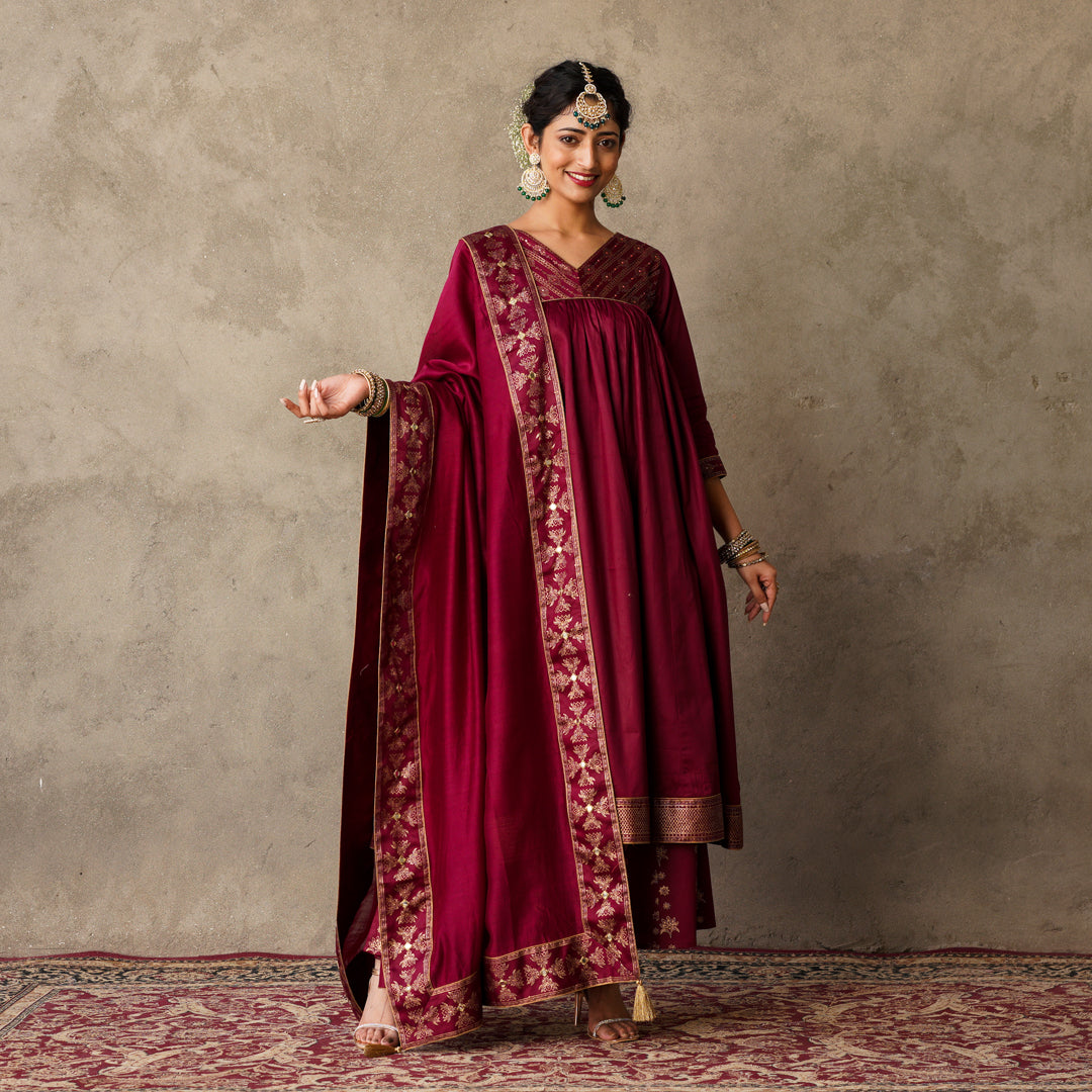 Elevate your style effortlessly with our timeless Chanderi dupatta in a striking shade of plum, embellished with a captivating gold handblock printed / Khari printed border with mirror embroidery details. Enhanced by charming tassels and intricate edge detailing, this versatile accessory is the perfect complement to any of our kurta and pant sets. Whether you prefer contrasting or matching colors, it's your canvas to craft your perfect look.