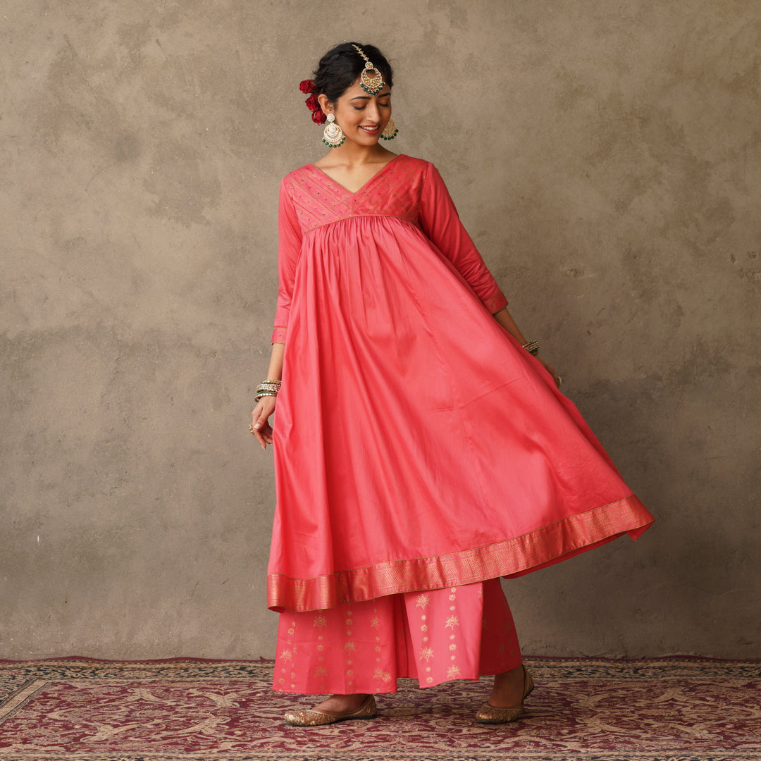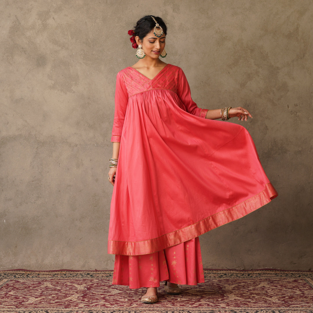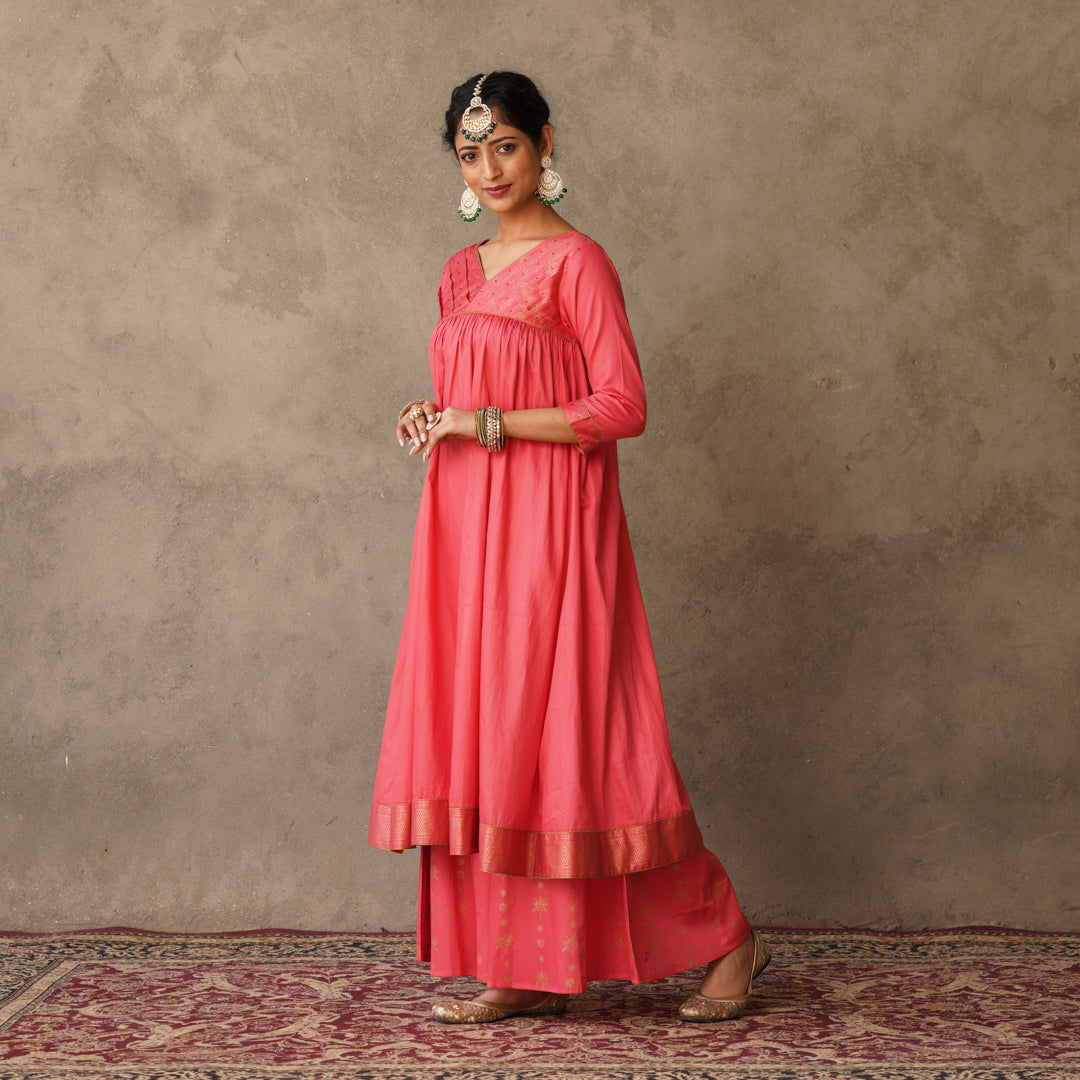 Explore our stunning coral Block Printed Anarkali Kurta with Sharara and Dupatta set, specially designed to make you shine during festivities this season!