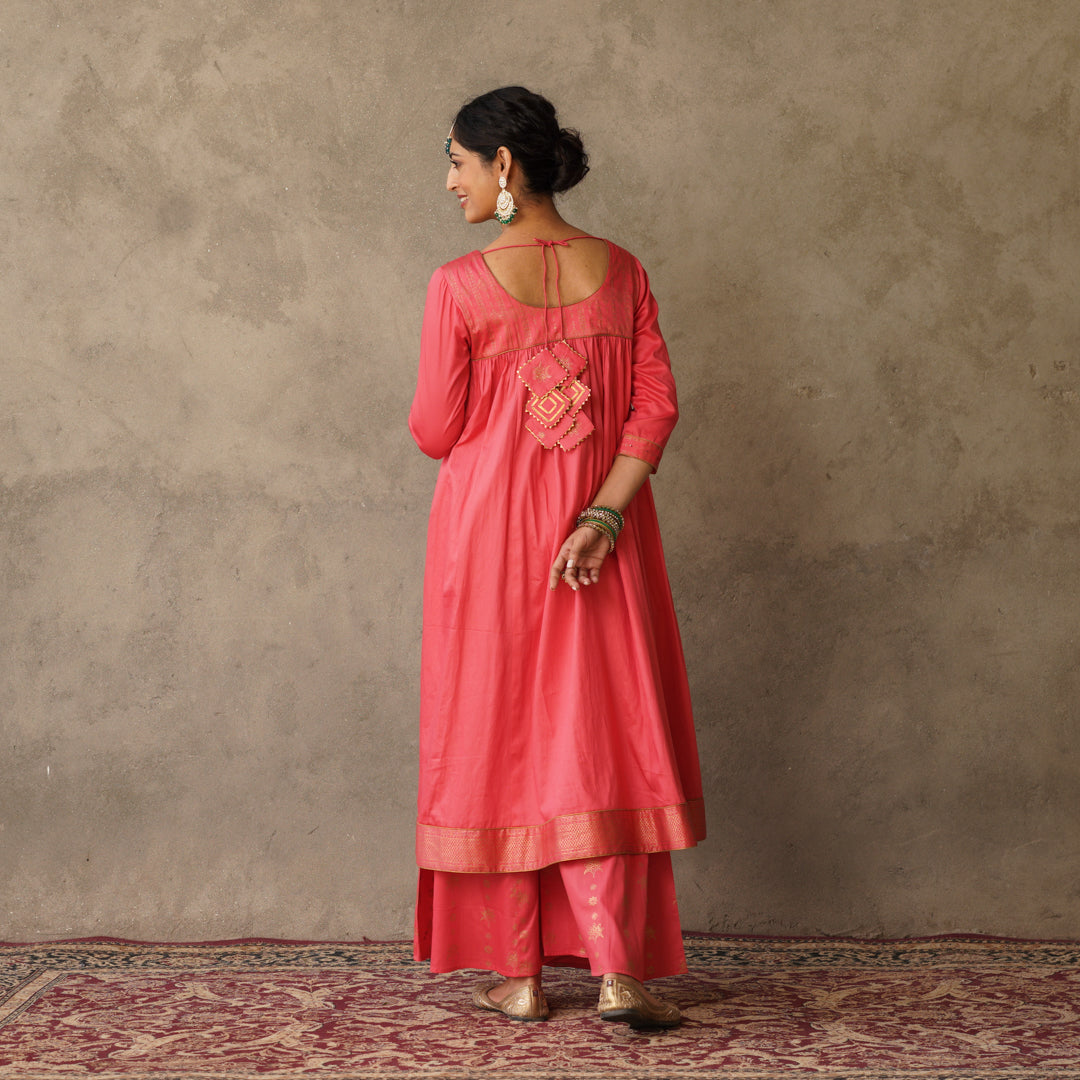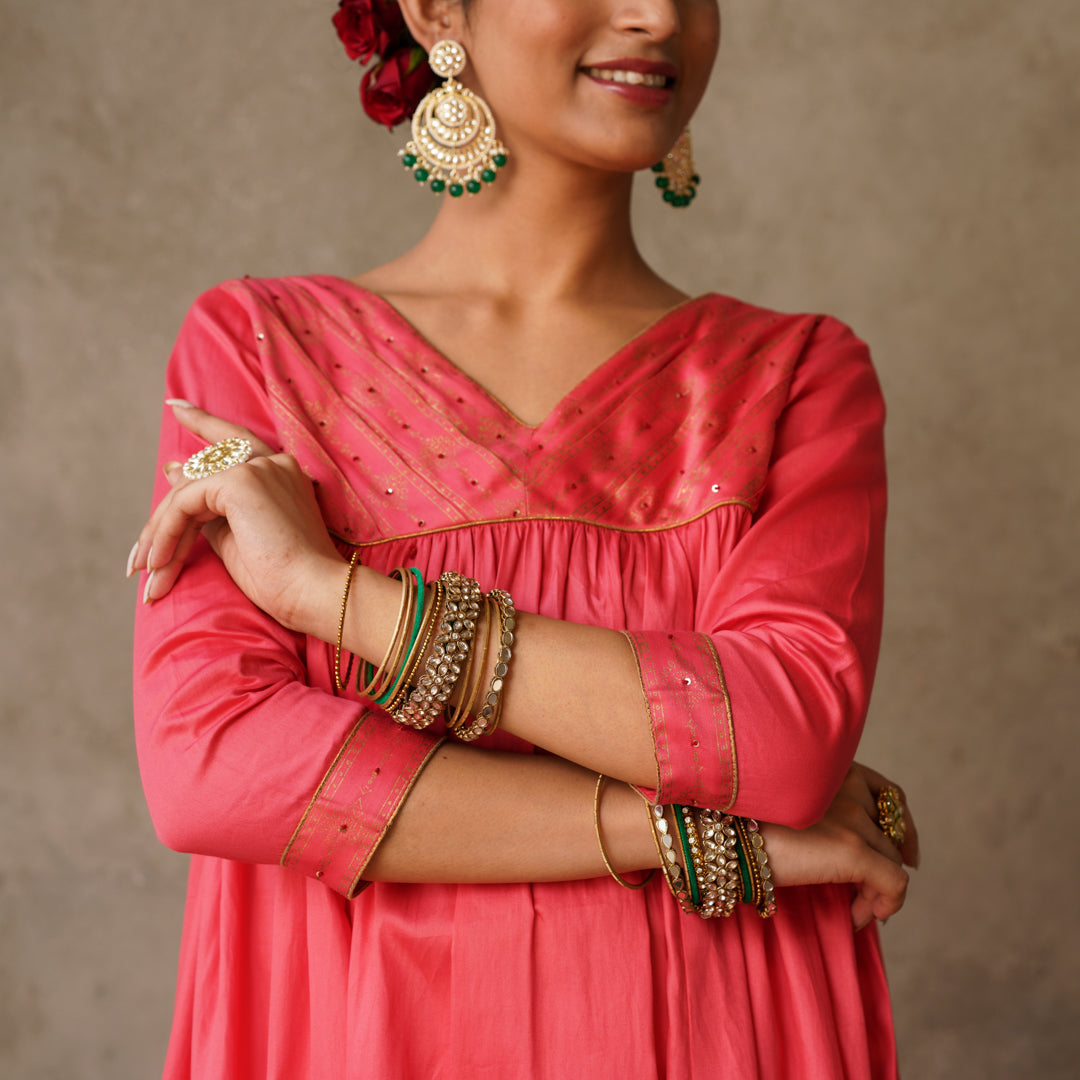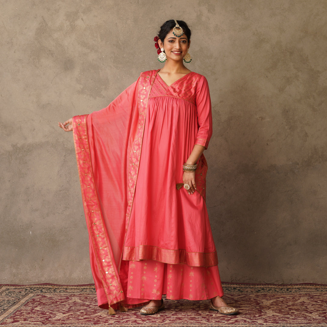 Coral Block Printed Anarkali suit Set with Hand Embroidery Details on Yoke Paired with Chanderi Dupatta (Set of 3)