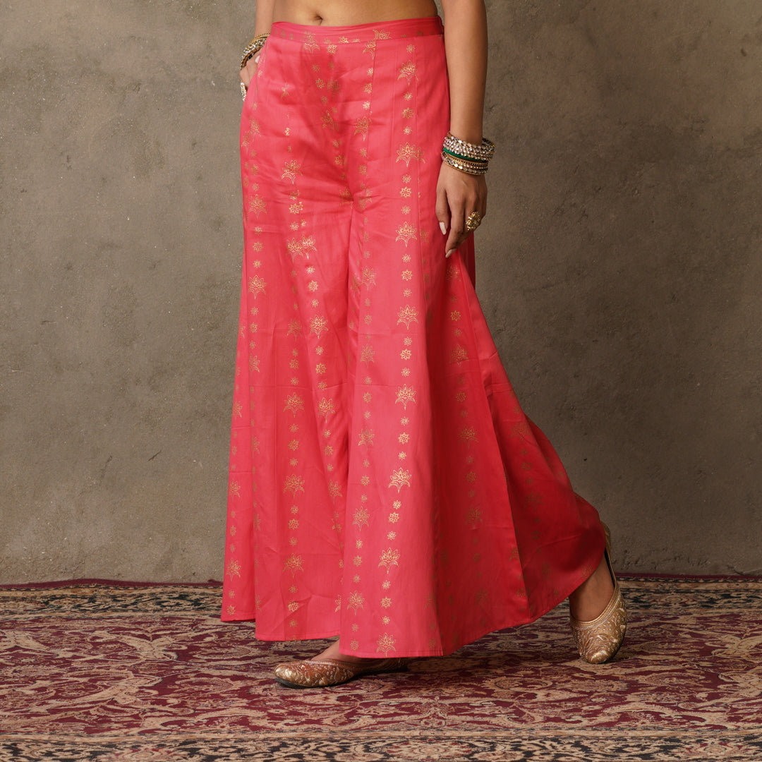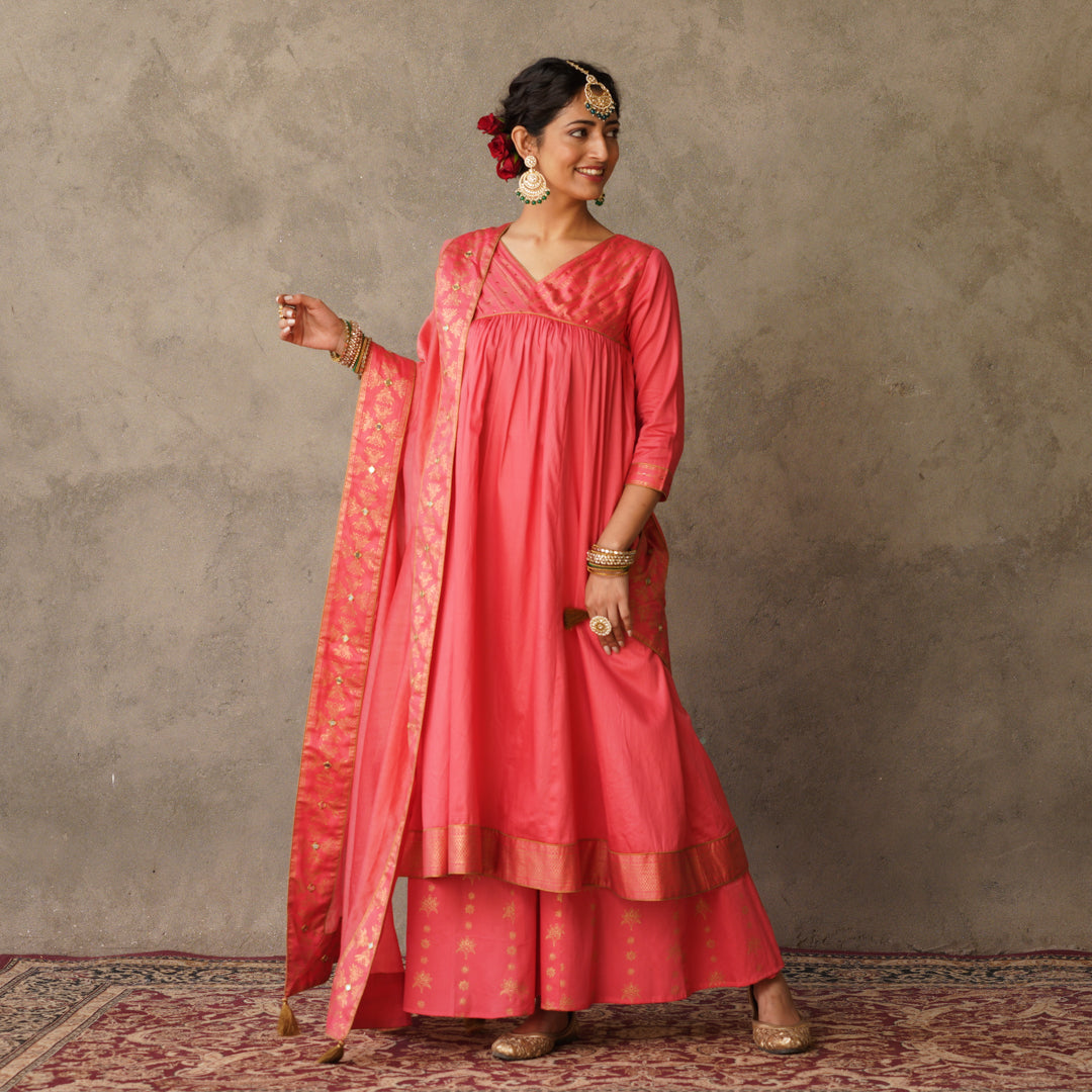 Get ready to embrace the joy of celebrations with this exquisite piece that effortlessly blends tradition and style. This Anarkali Kurta and Chanderi Dupatta with Khari printed yoke and details in gold with matching printed Sharara is a true masterpiece. The co-ord set / Anarkali Sharara set with Dupatta is perfect for those special moments that deserve a touch of elegance and grace.