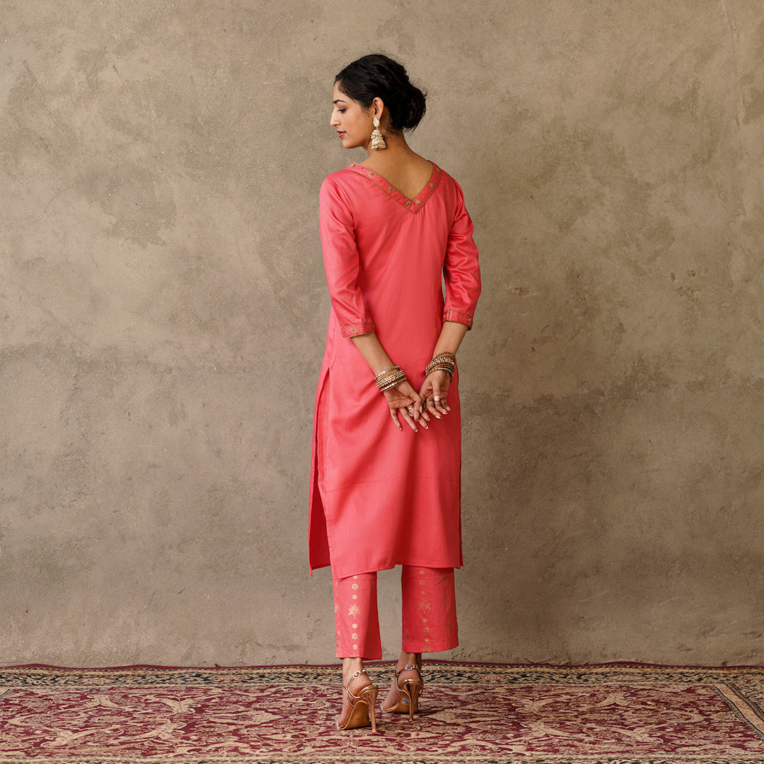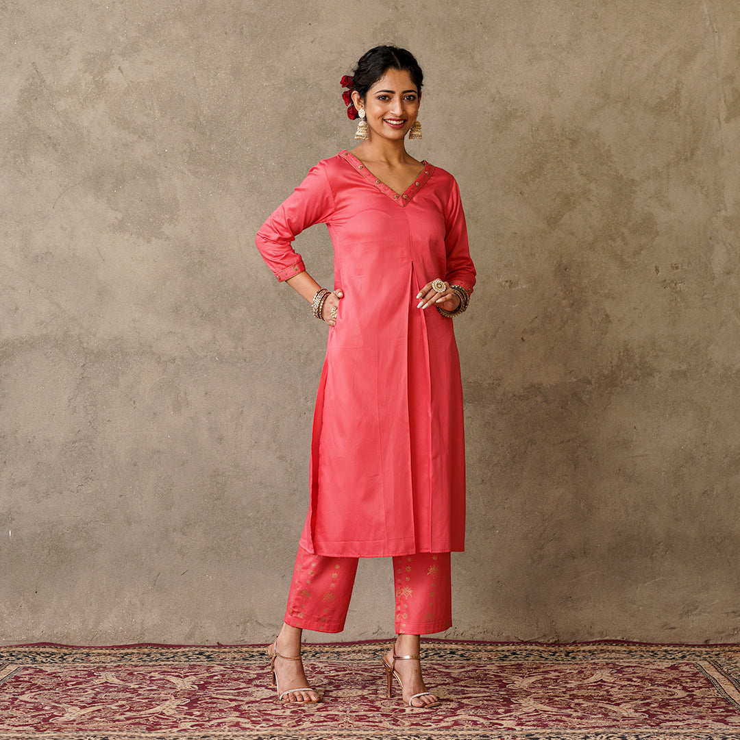 Front Pleat Solid Coral Kurta with Hand Embroidery and Gold Printed Details with Printed Pants (Set of 2)