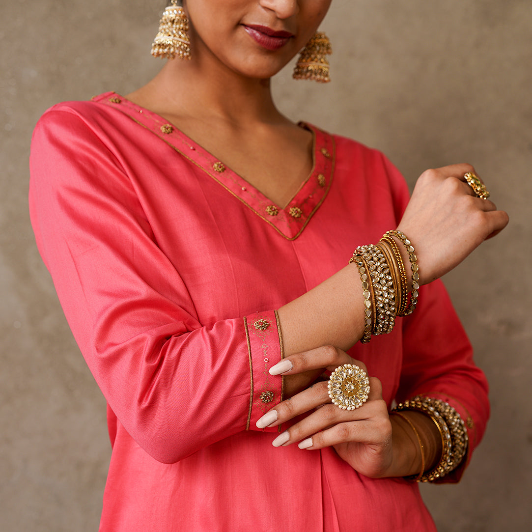 Celebrate the beauty of individuality and grace with this exquisite coral kurta and matching printed pants, meticulously crafted using a combination of hand embroidery and gold block printing techniques.