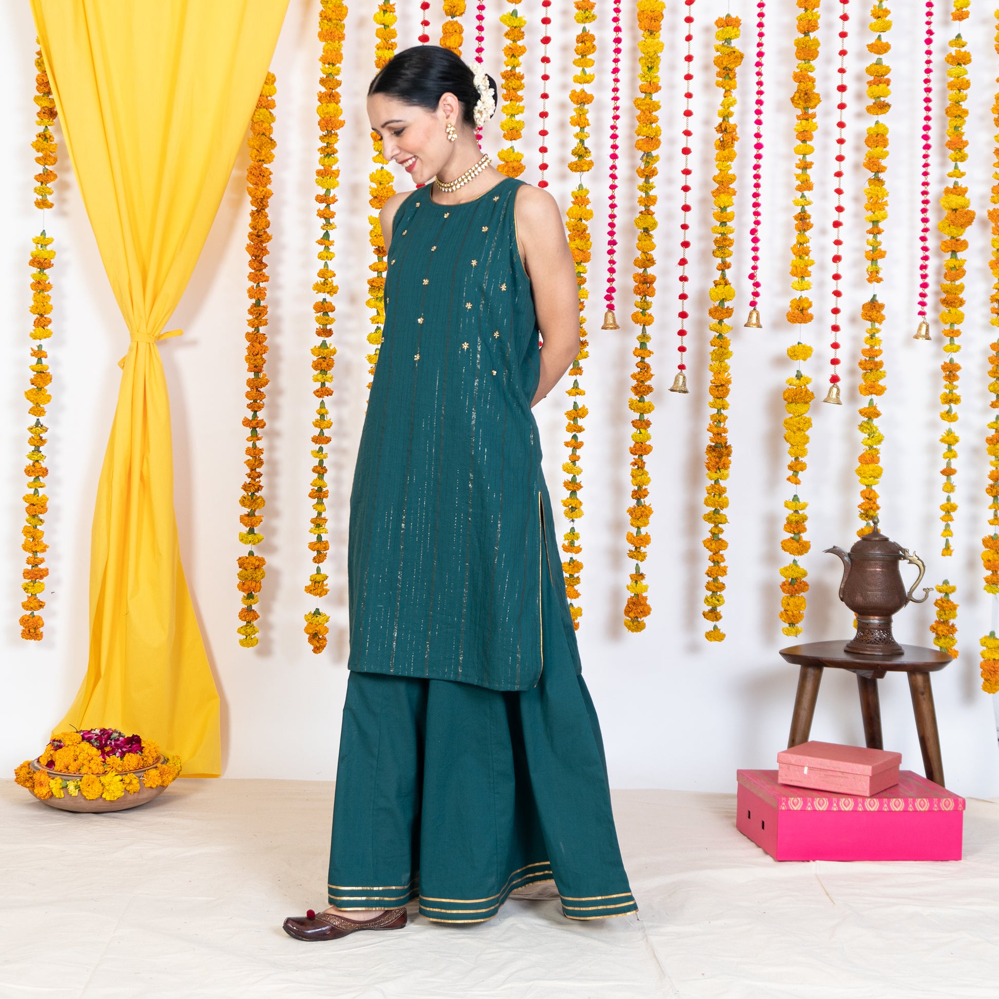 Green Round Neck, Sleeveless Embroidery Short Kurta