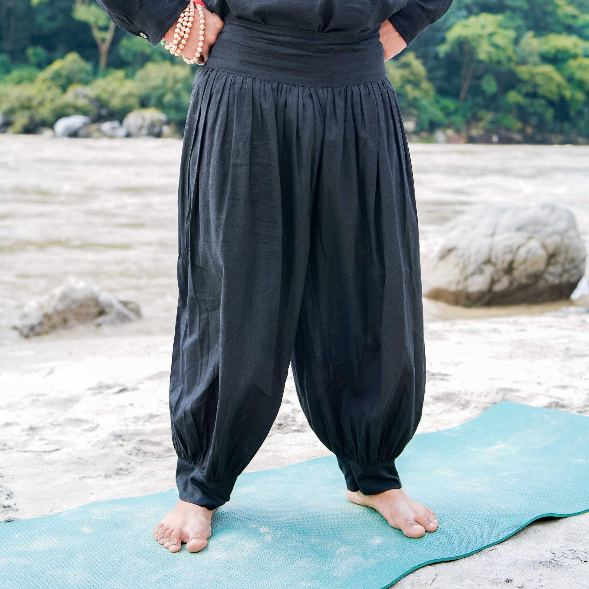 The PRITHVI pants are made from 100% cotton in black. The flared fit pants have been designed to allow you to flow and move with ease. The pants come with a broad waist band for extra support and narrow ankle to ensure they dont ride up when practicing.