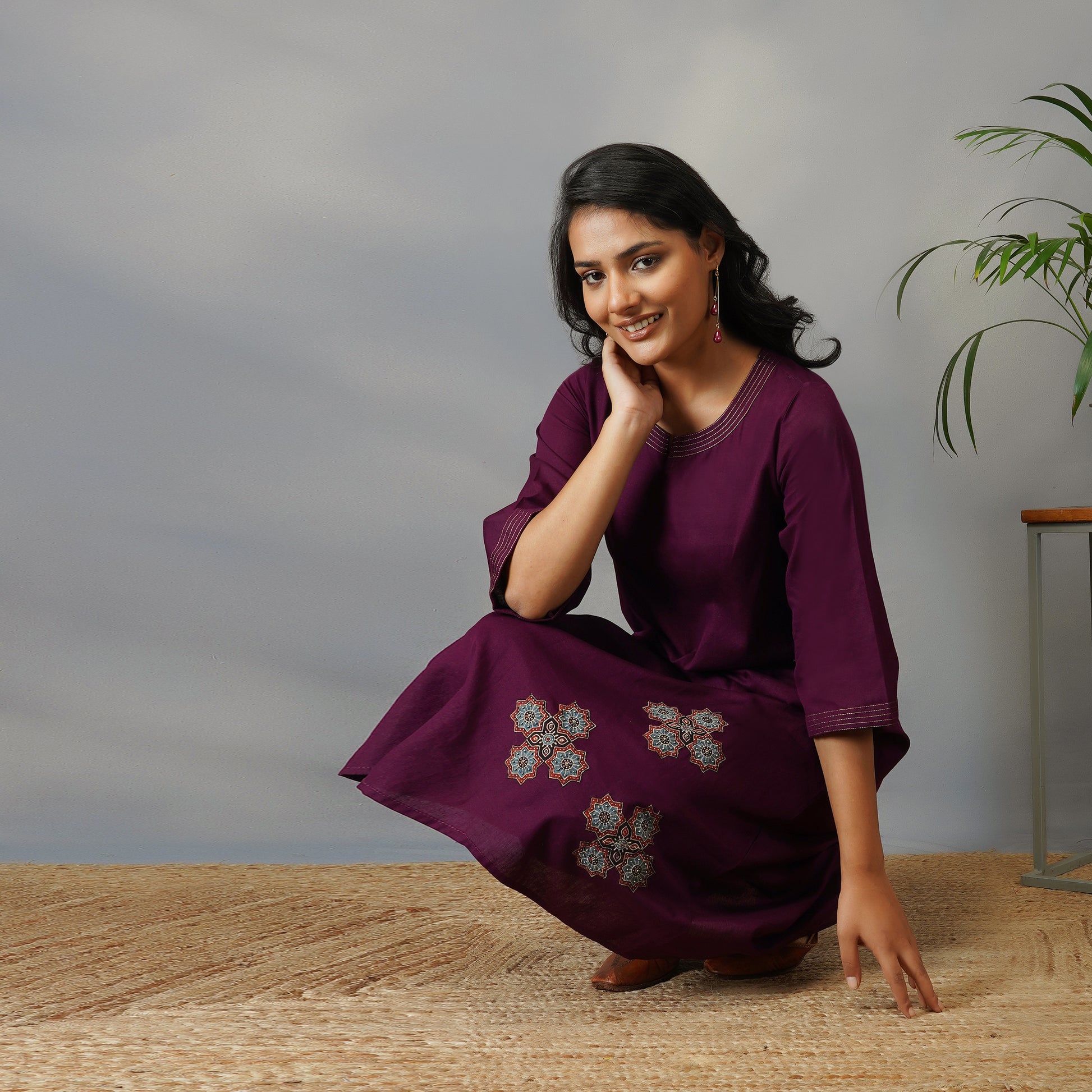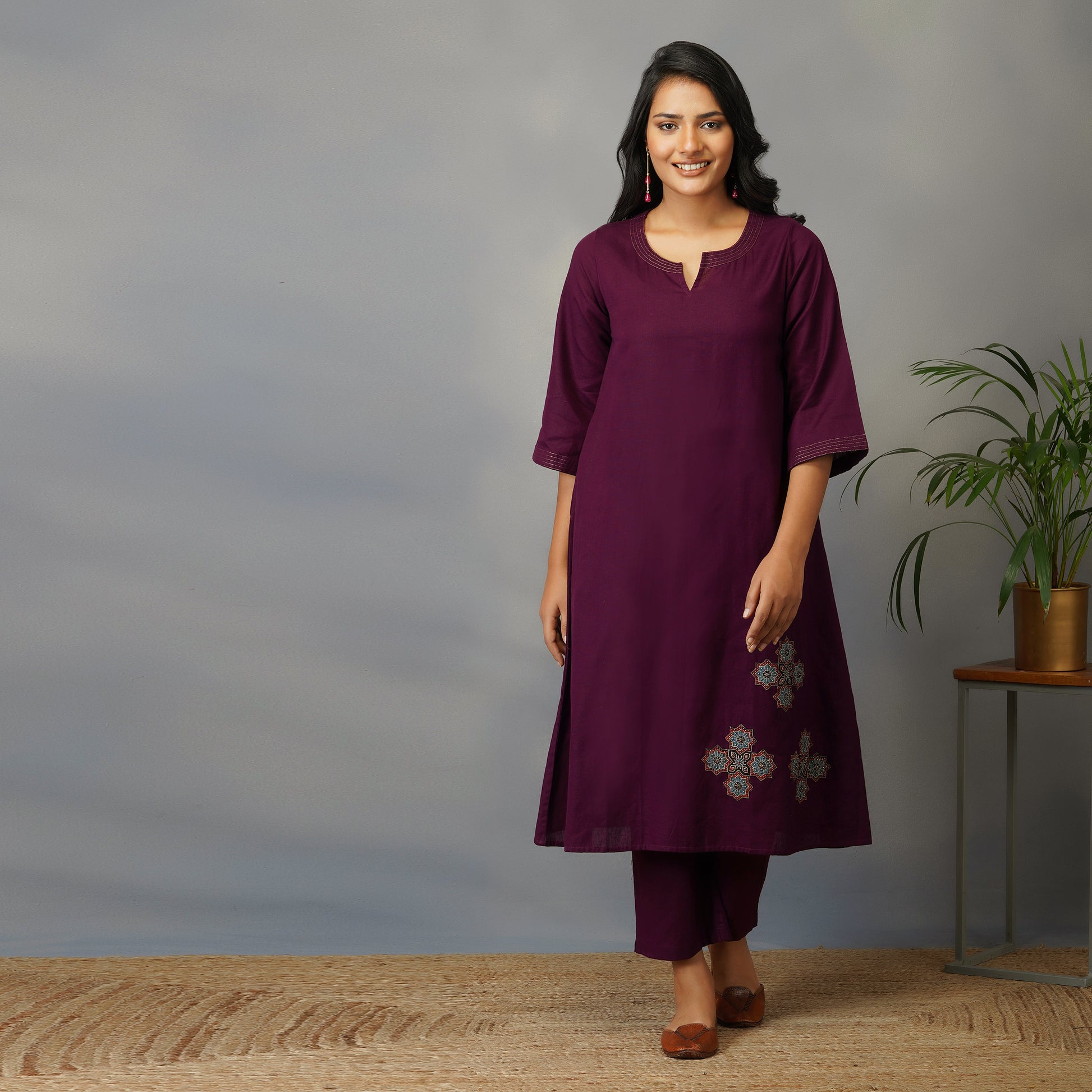 Mulberry (Purple) A Line Kurta with Handblock Ajrak Patch Work Set with Pants (Set of 2)