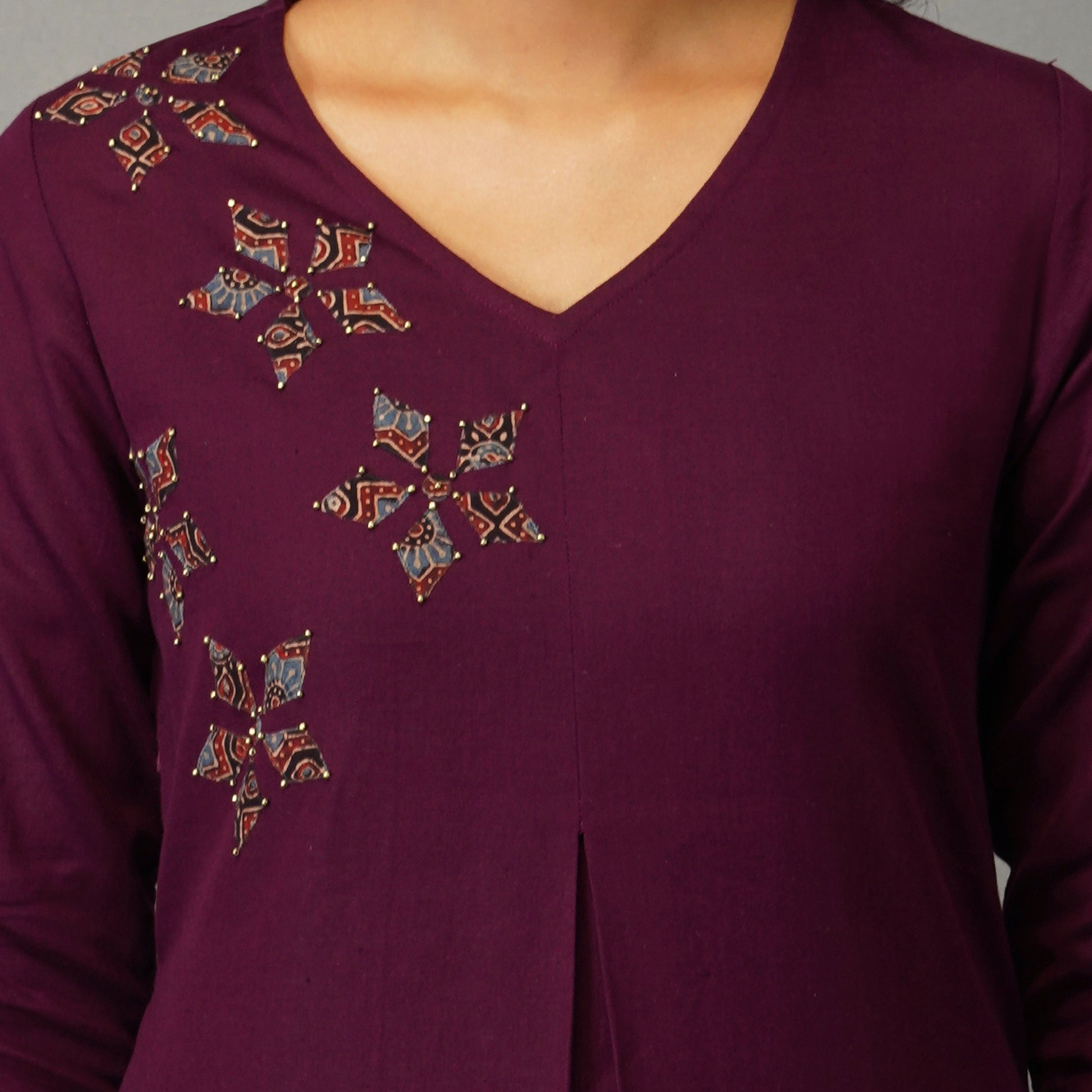 Mulberry (Purple) Straight Kurta with Ajrak Applique work set with Pants (Set of 2)