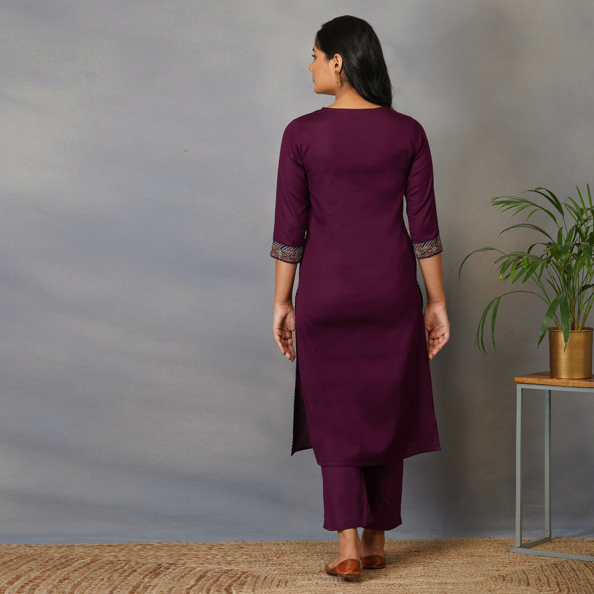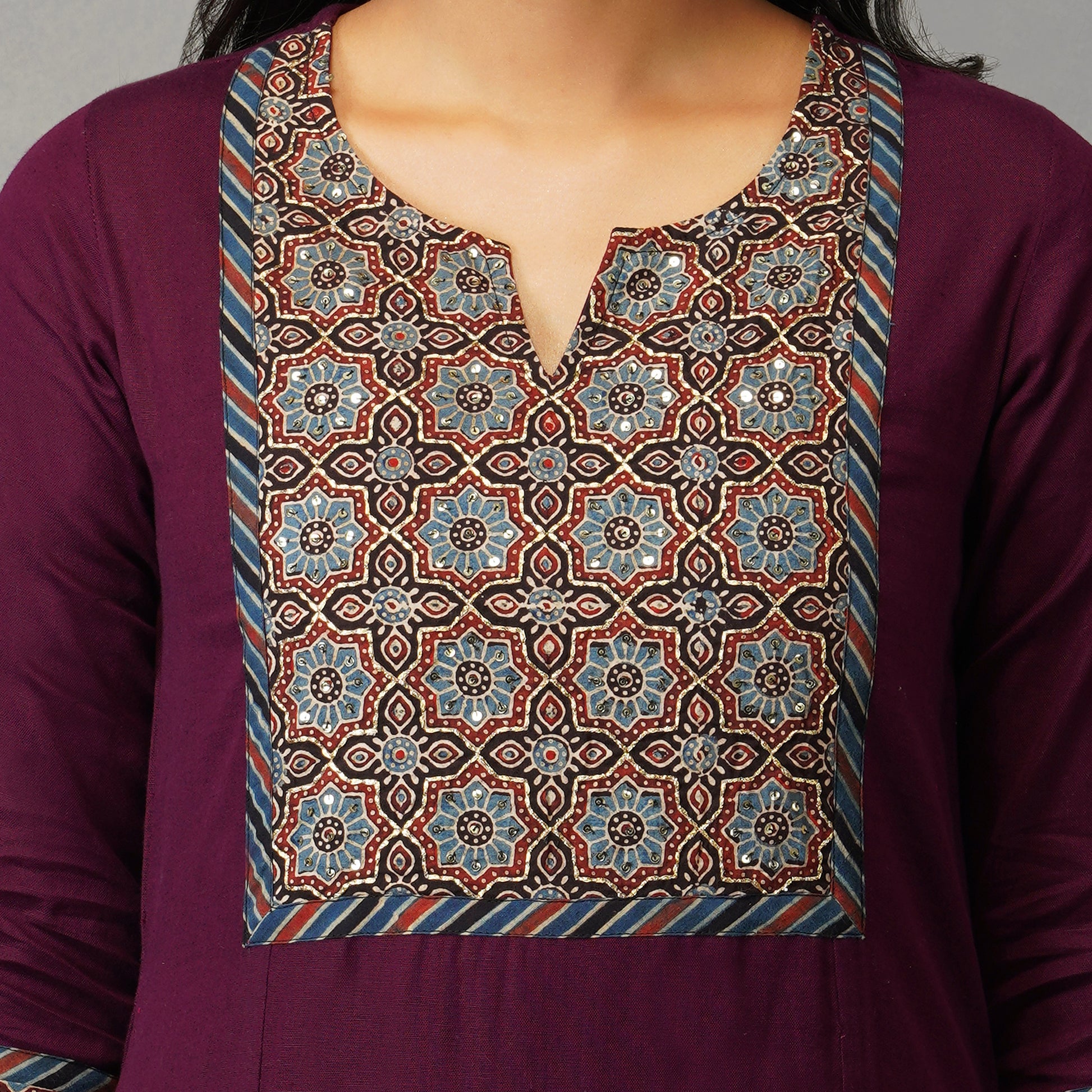 Mulberry (Purple) Straight Kurta with Ajrak Yoke in Zari Embroidery