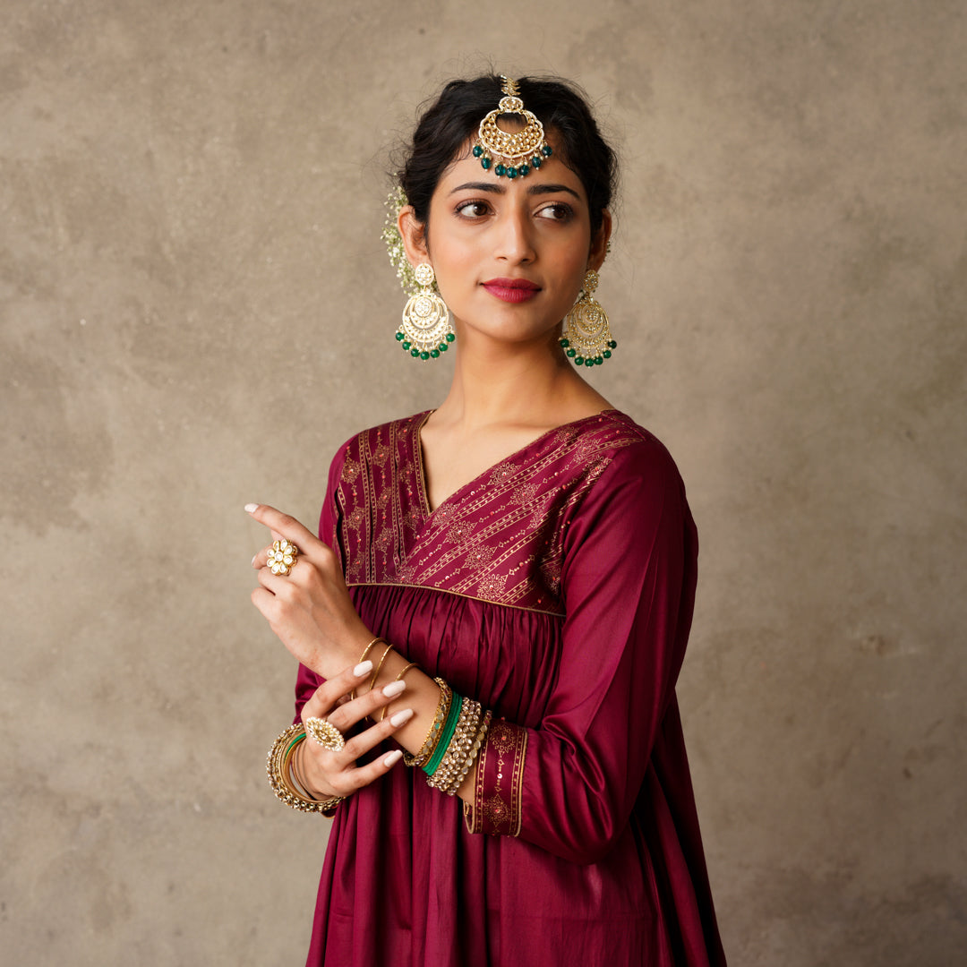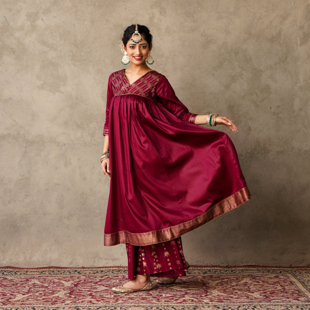 Adorned with a captivating shade of rich plum and brought to life through the timeless khari printing technique, this kurta is a radiant canvas showcasing our age old traditions.