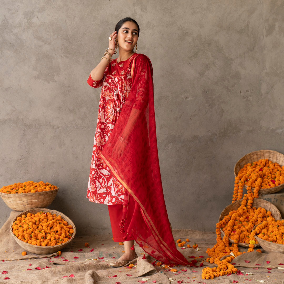 Embrace the magic of festivities and the allure of artistry with this remarkable suit set, where the magic of traditional wooden block print techniques meets the beauty of hand embroidery. Crafted from 100% cotton, this ensemble offers more than just style – it promises unparalleled comfort throughout the season. Create lasting memories and cherish the joy of traditions with this unique and authentic piece in your wardrobe.
