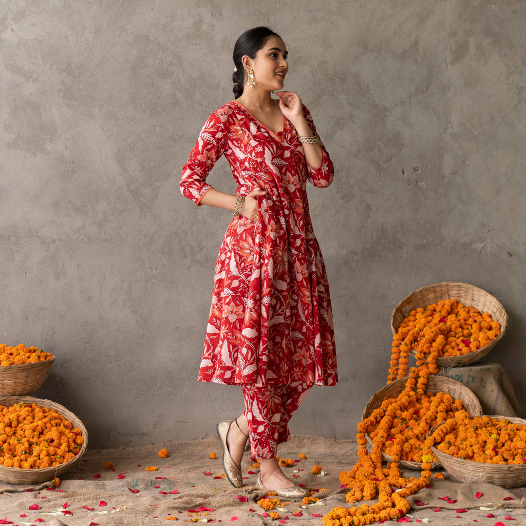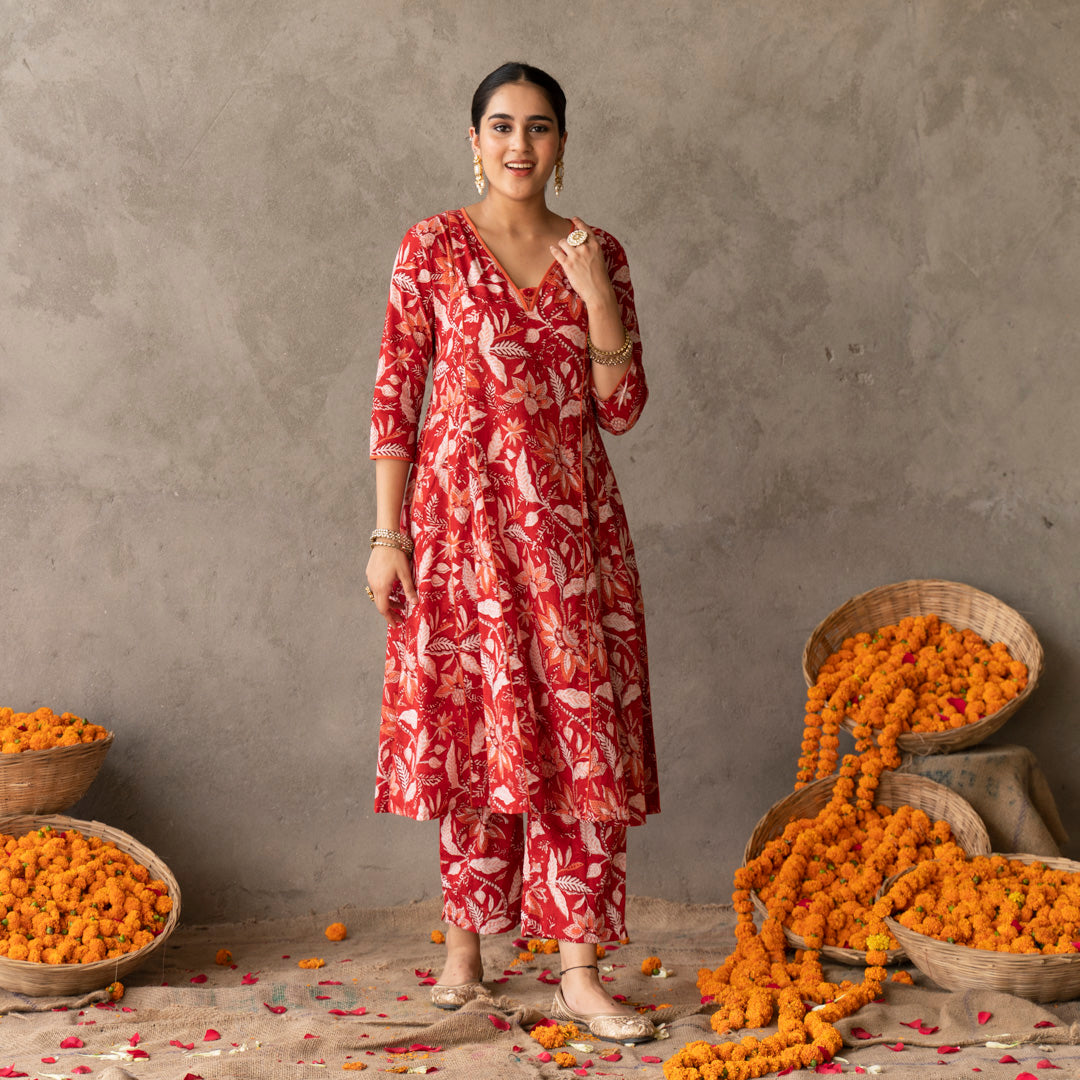 Celebrate individuality and grace with this kurta, meticulously crafted using traditional wooden block print techniques along with hand embroidery, the kurta tells a story of artistry. Skilled craftsmen dip wooden blocks into rich dyes and carefully stamp them onto the fabric, resulting in this unique and intricate design. Crafted from 100% cotton, embrace the season in style as this lightweight and breathable ensemble ensures unparalleled comfort