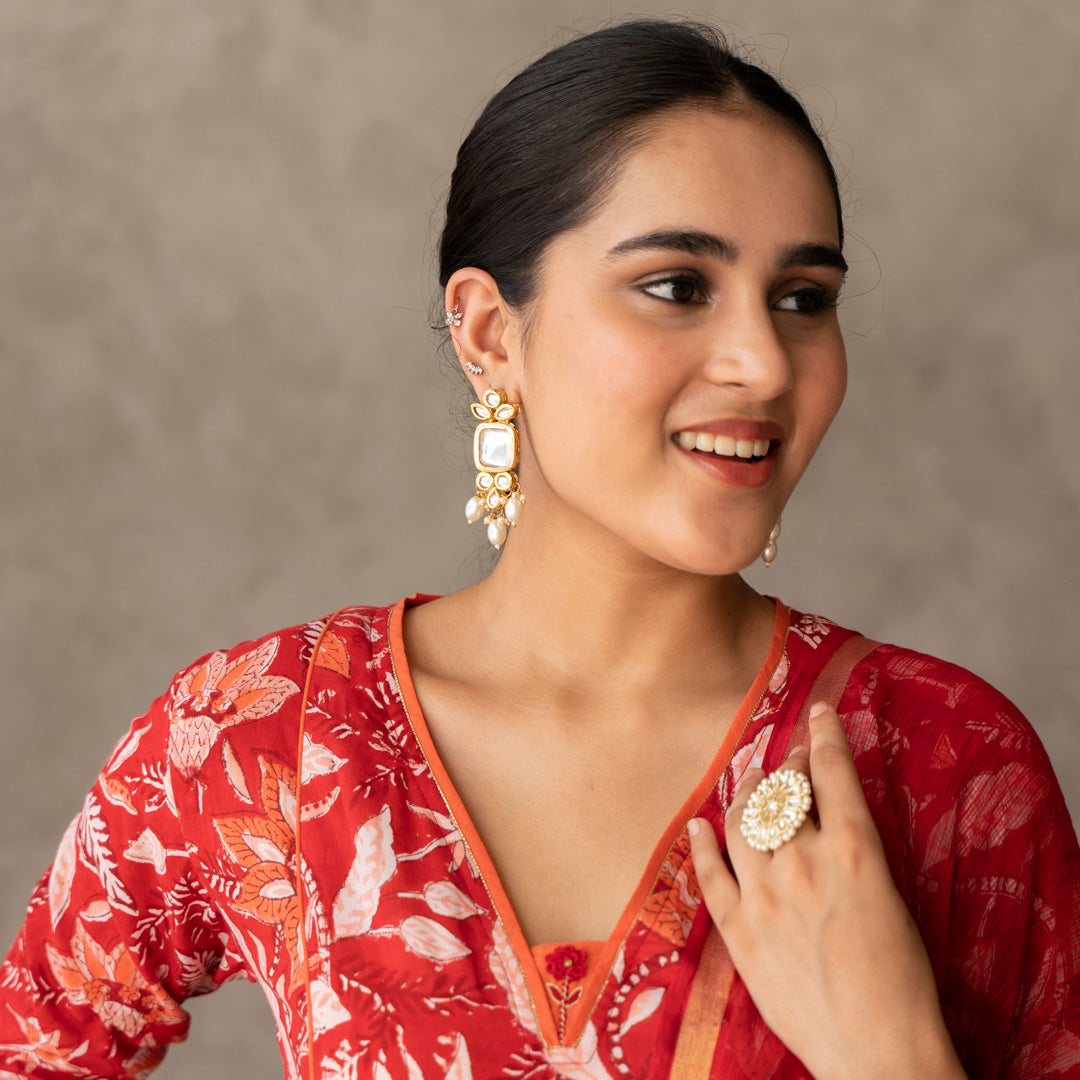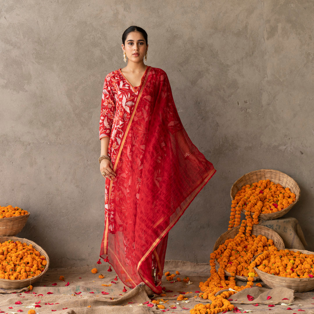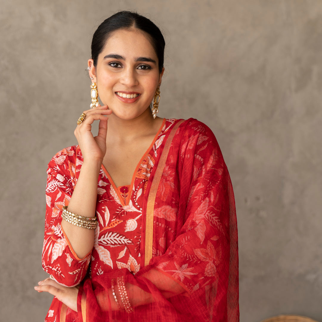 Red block printed panelled with contrast piping detail anarkali suit set with dupatta