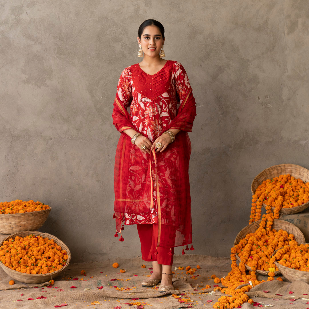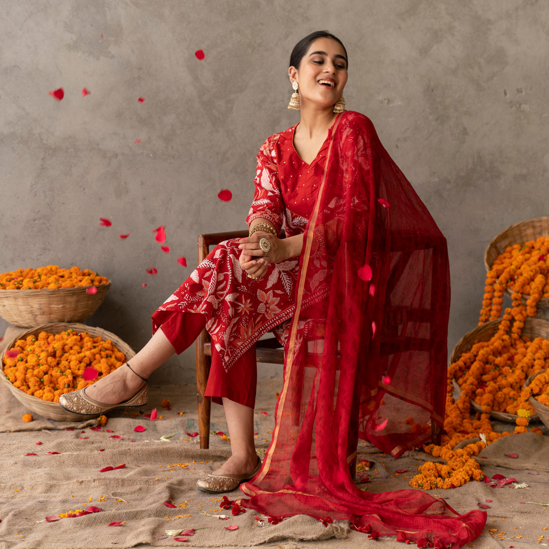 Elevate your style with this stunning suit set, meticulously crafted from 100% cotton. Designed to embrace this festive season, it offers a and utterly comfortable experience. Every detail on this kurta tells a captivating story of skilled craftsmen dipping wooden blocks into rich dyes and carefully stamping them onto the fabric, creating a design that is both unique and intricate. Adorned with a captivating red colour and crafted using the traditional wooden block technique, this suit set showcases the artistry of skilled craftsmen.