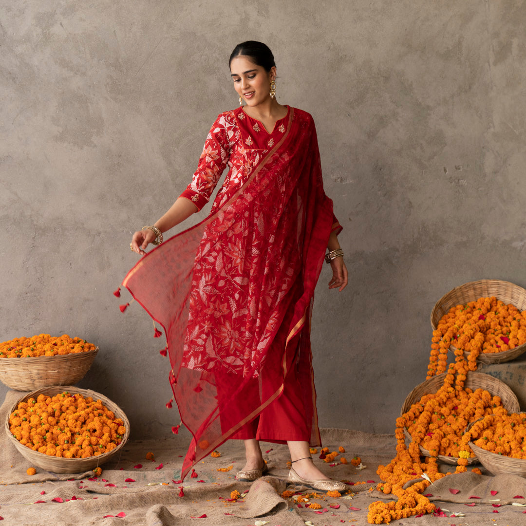 Step into elegance with our classic pure cotton chanderi dupatta in a captivating red hue with a mesmerizing shibori tie dye print. This versatile accessory is adorned with charming tassels and intricate edge details, adding a touch of sophistication to your ensemble. Pair it effortlessly with any of our exquisite kurtas and pant sets, and explore the freedom of mixing and matching in contrasting or matching colors to create a look that's uniquely you.