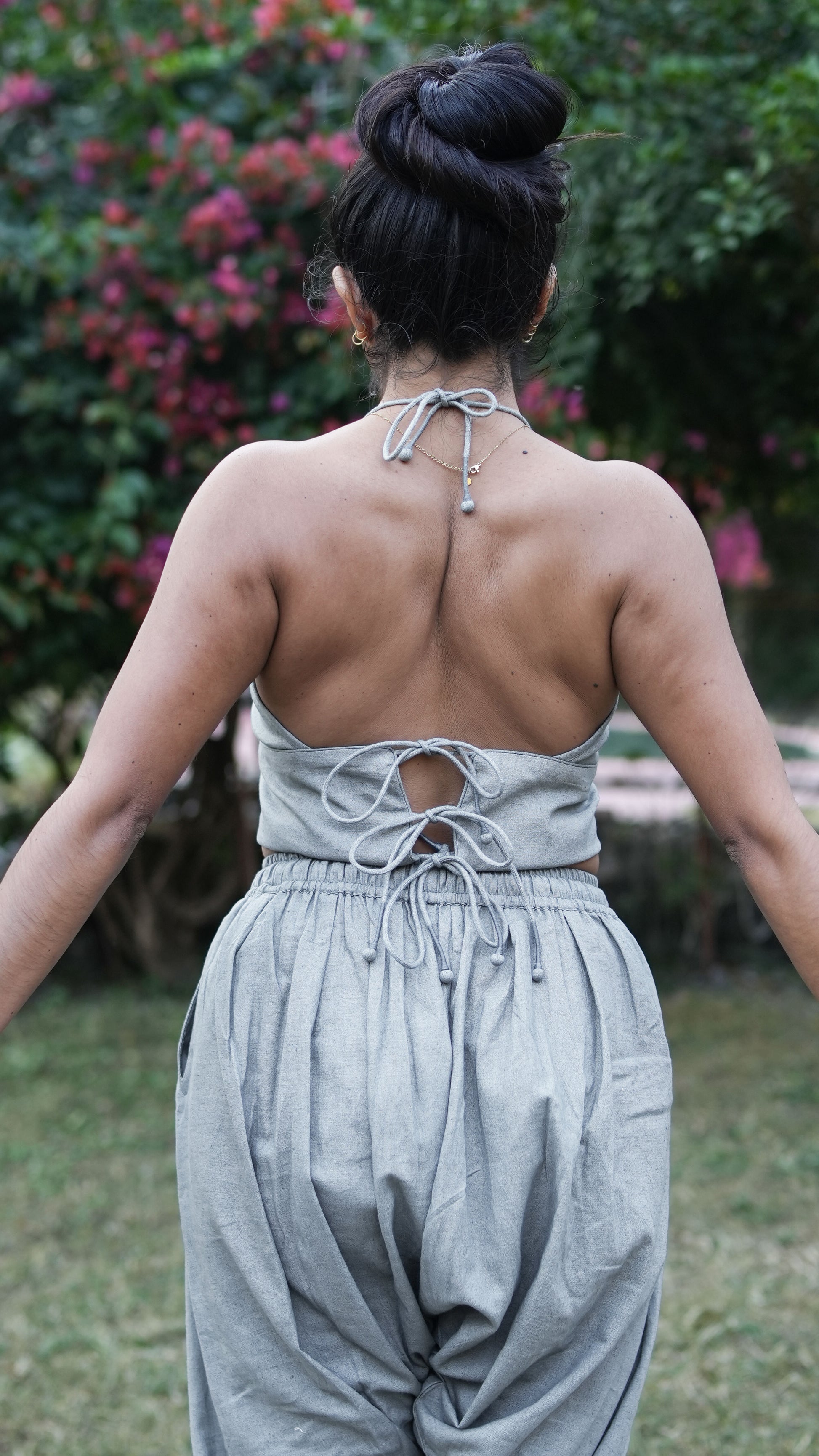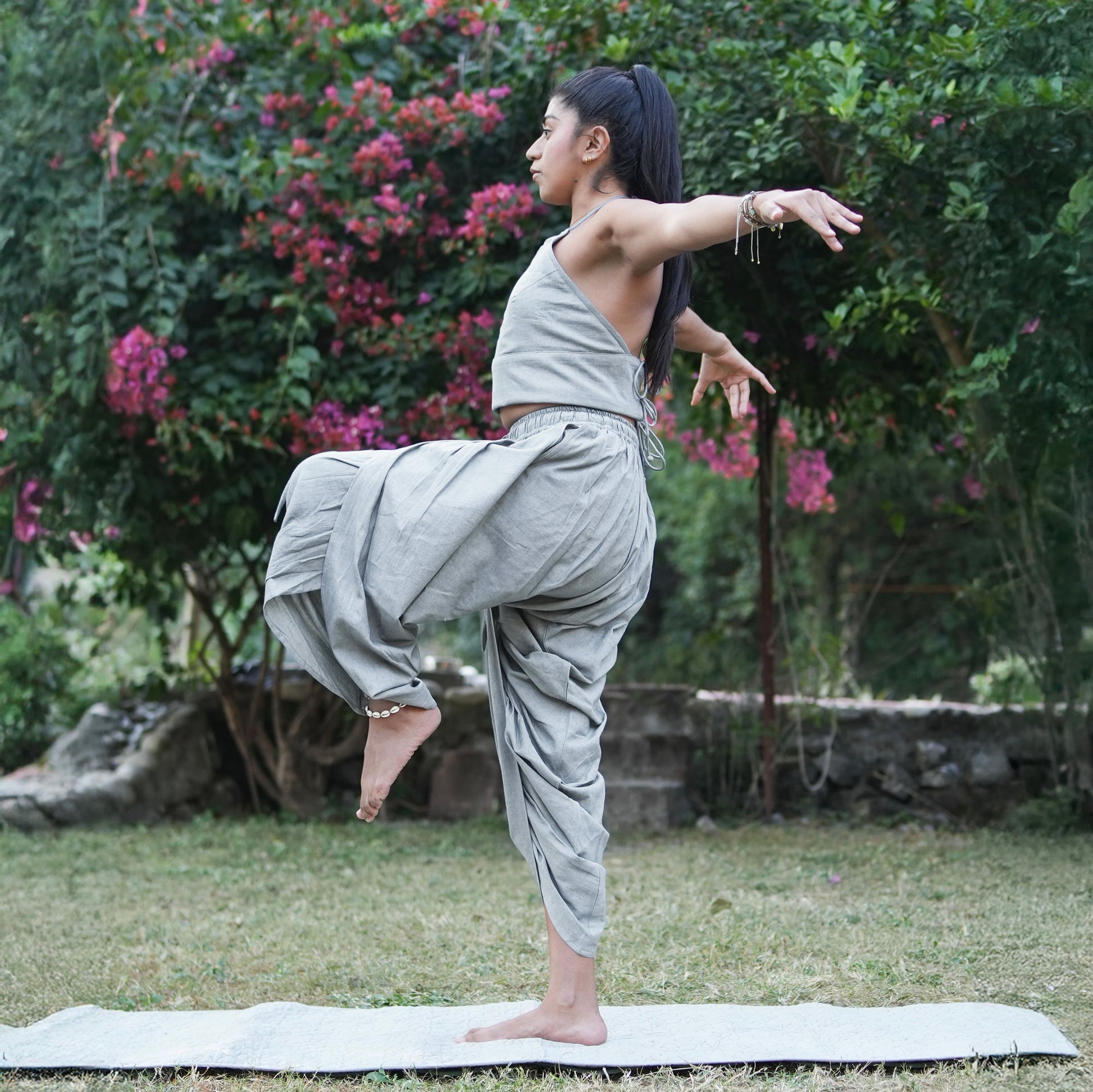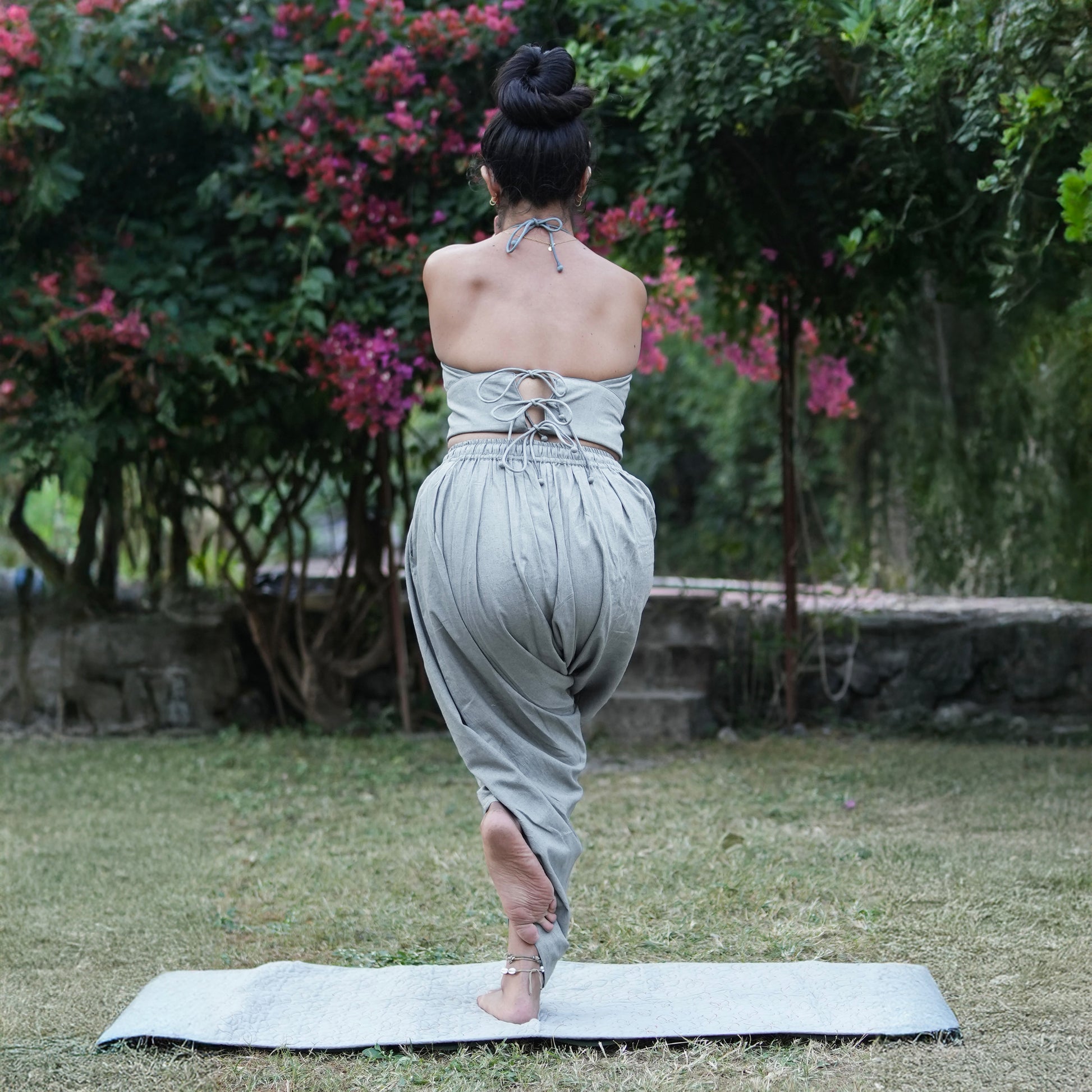 The AKASHA set is made from unbleached 100% cotton. The backless top comes with thread ties to secure it in place at the neck and back. The dhoti style pants come in a relaxed fit and with pockets, both designed to allow you to flow and move with ease.