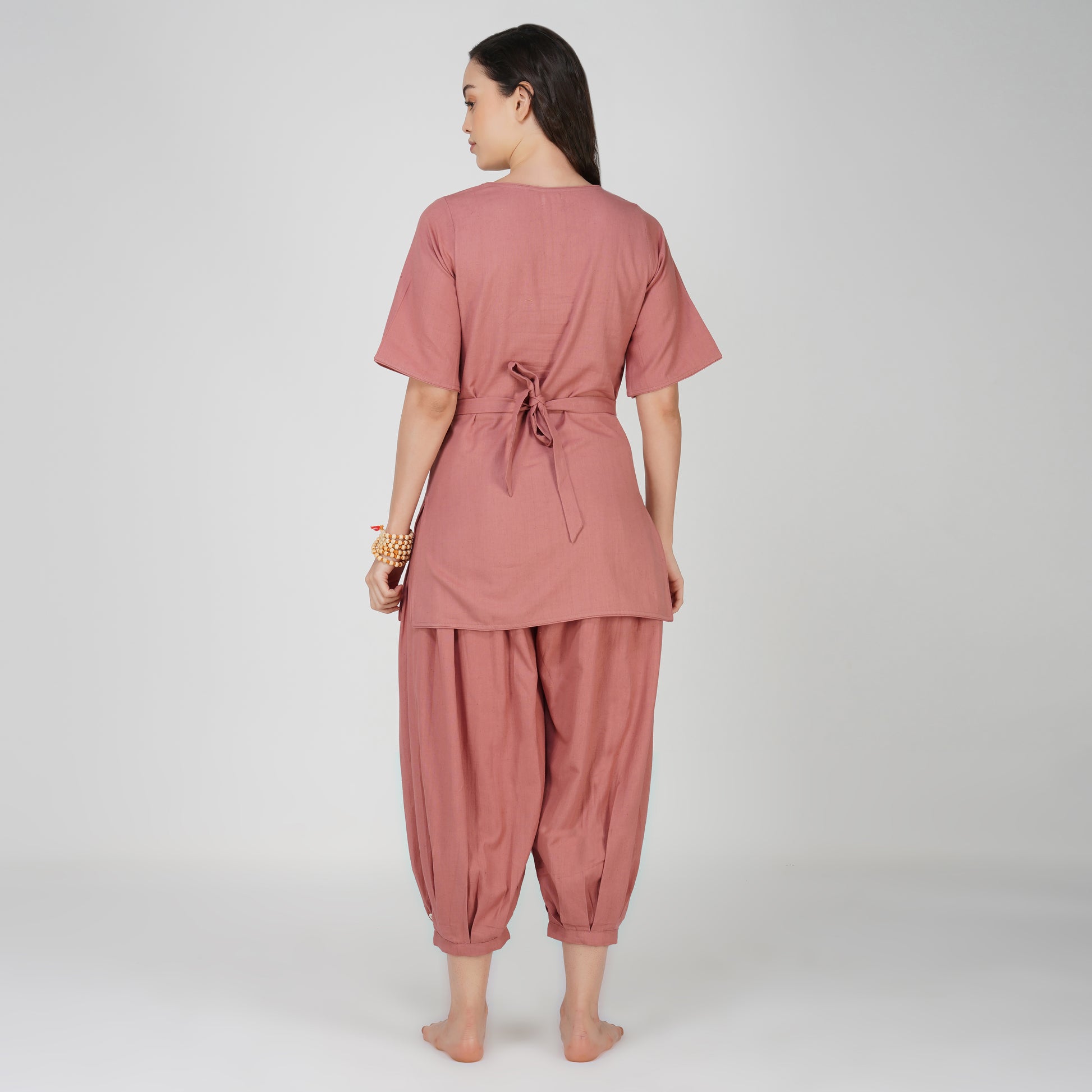 This kurta style top has a tie up at the waist to ensure it does not ride up as you move through various asanas and inversions.The pant cinches at the ankle to ensure it does not ride up as you move through various asanas and inversions.