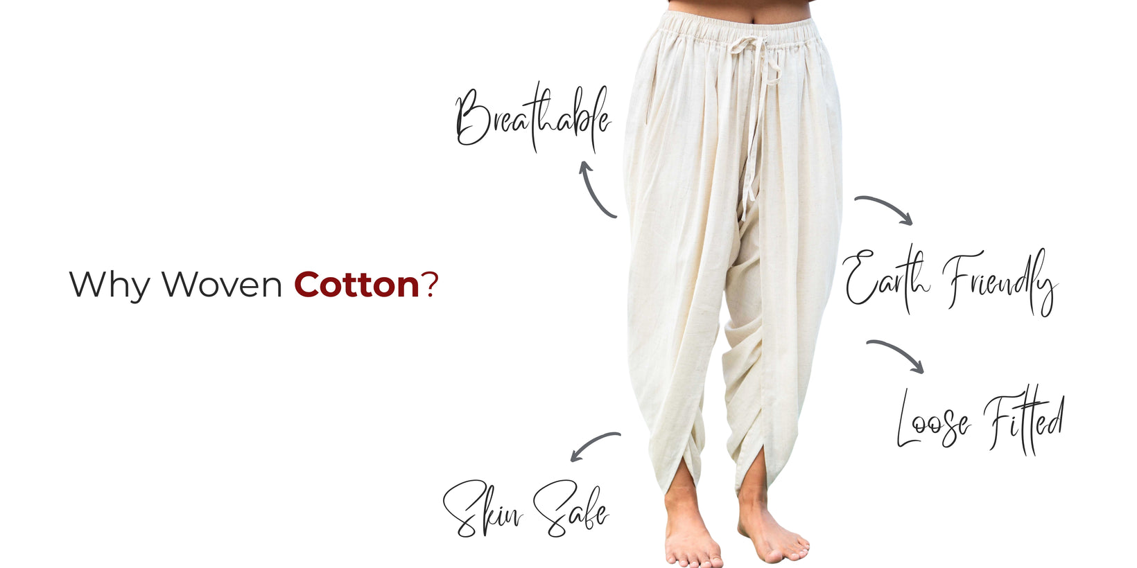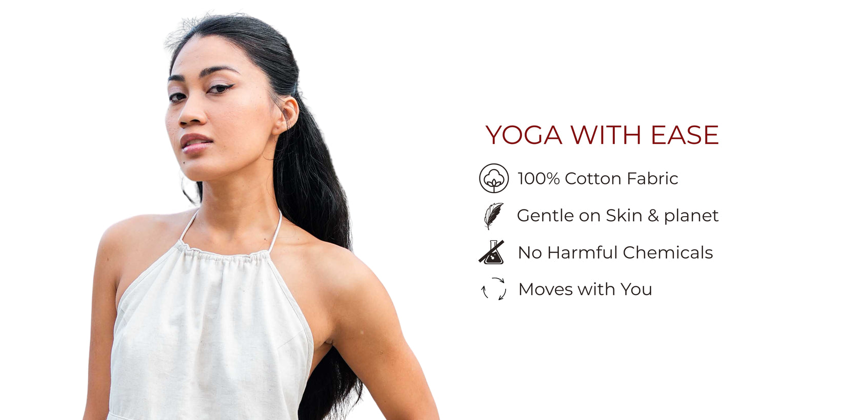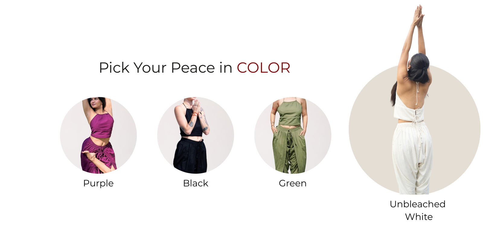 Our tops and pants for women, come with fastenings like drawstrings, wooden beads, buttons and tie ups, that prevent them from riding up during inversions or challenging poses, giving you comfort during practice.