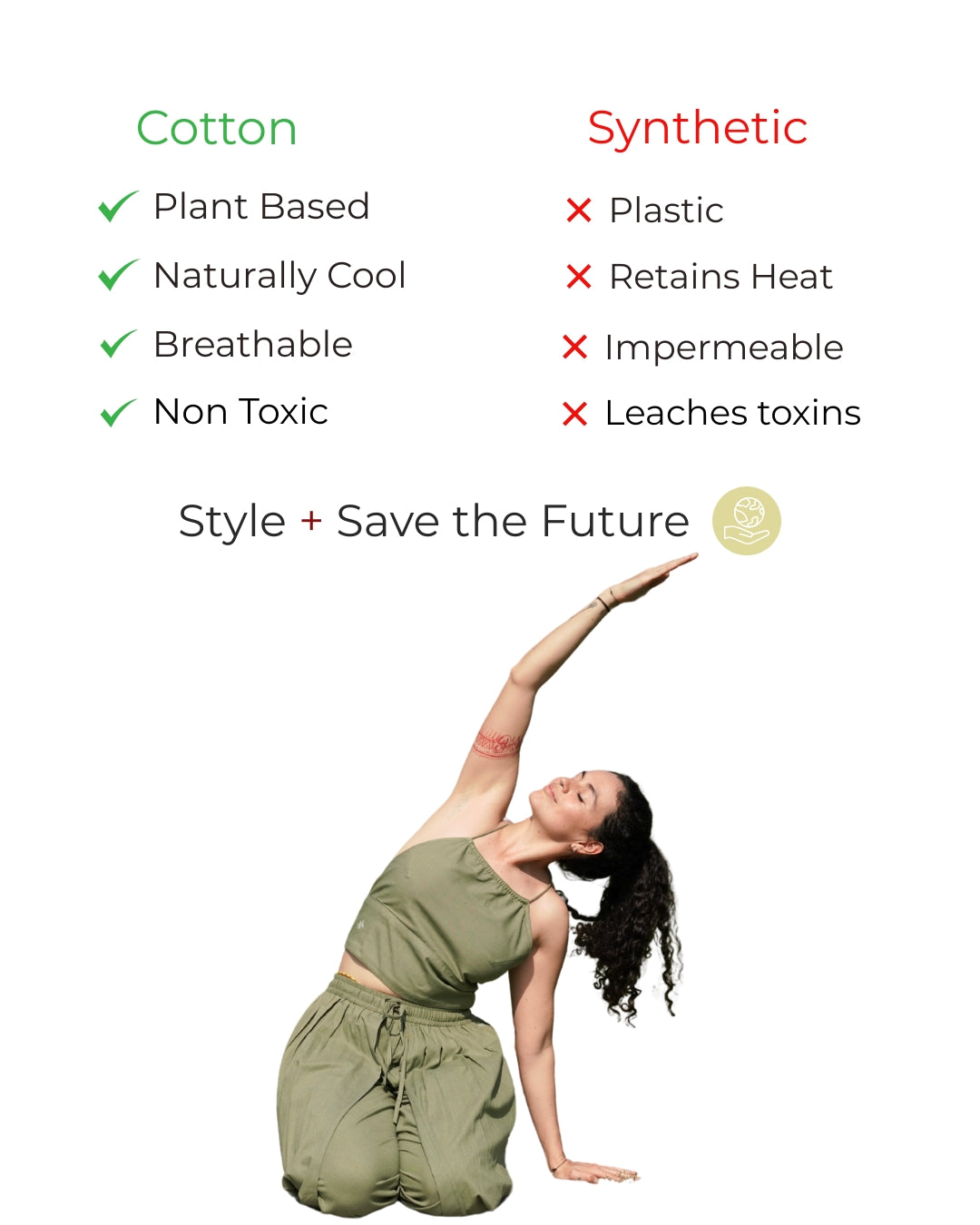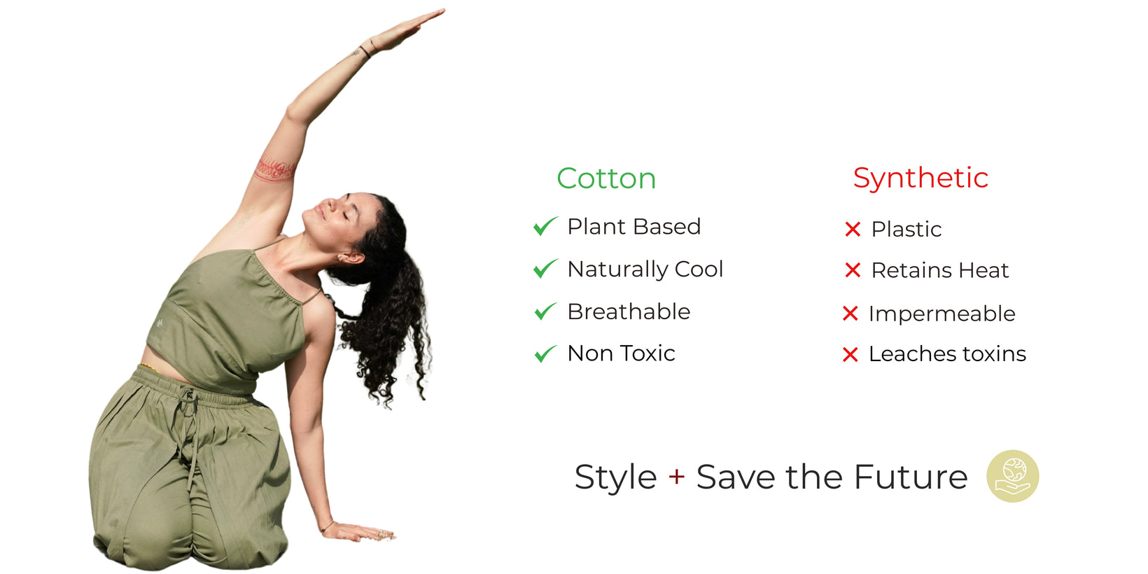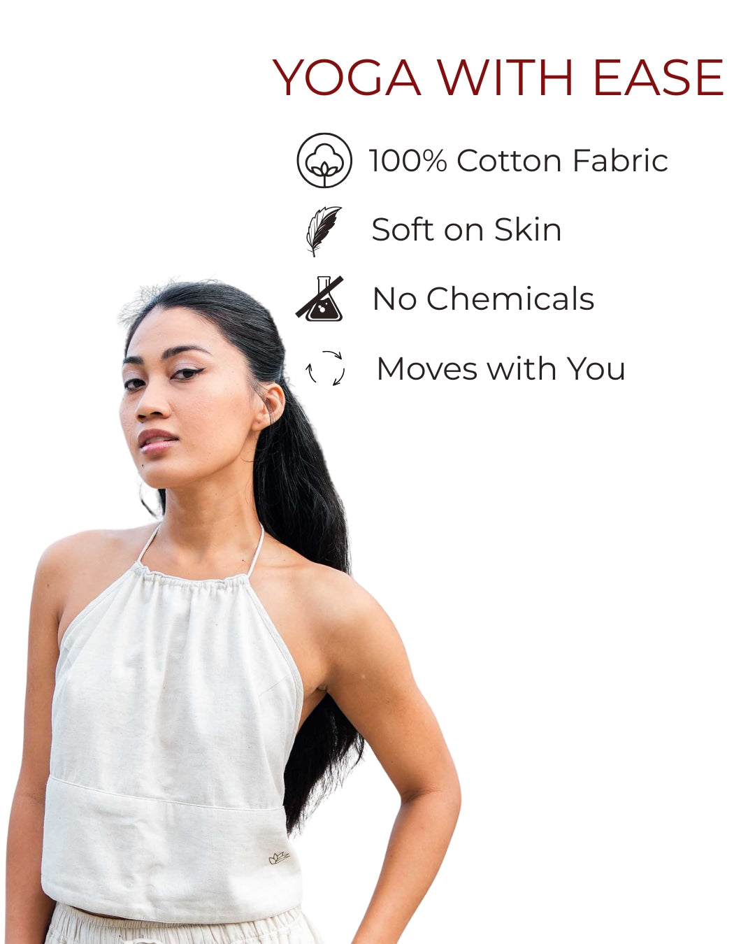 Our tops and pants for women, come with fastenings like drawstrings, wooden beads, buttons and tie ups, that prevent them from riding up during inversions or challenging poses, giving you comfort during practice.