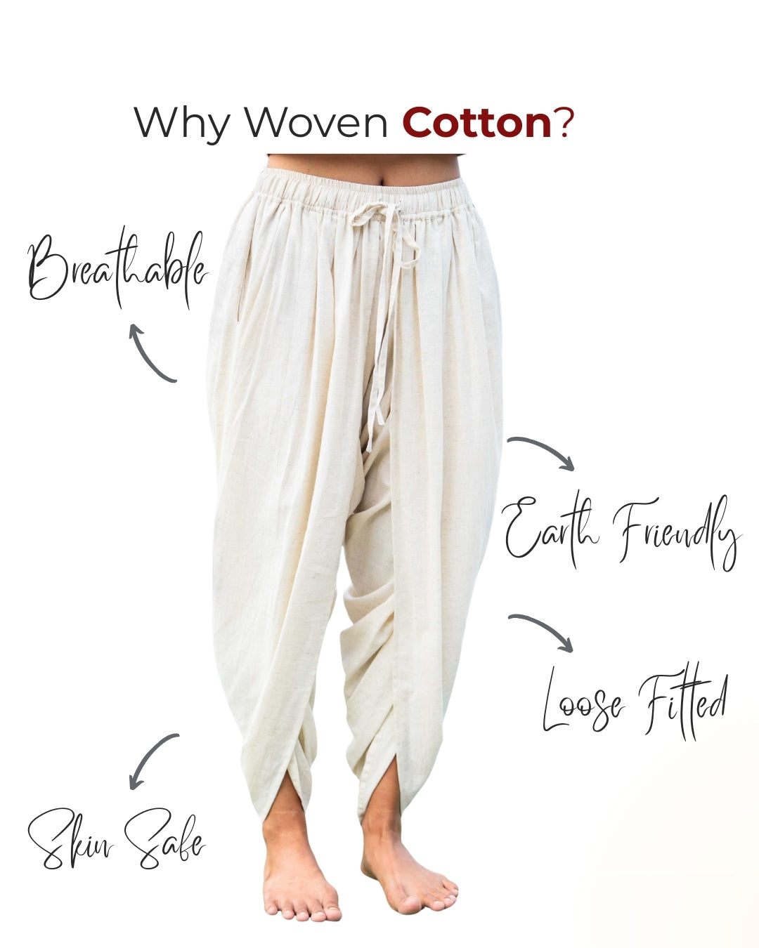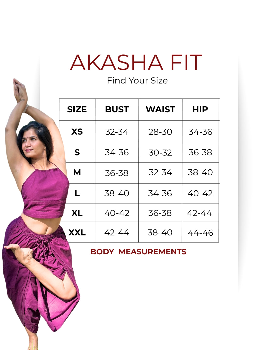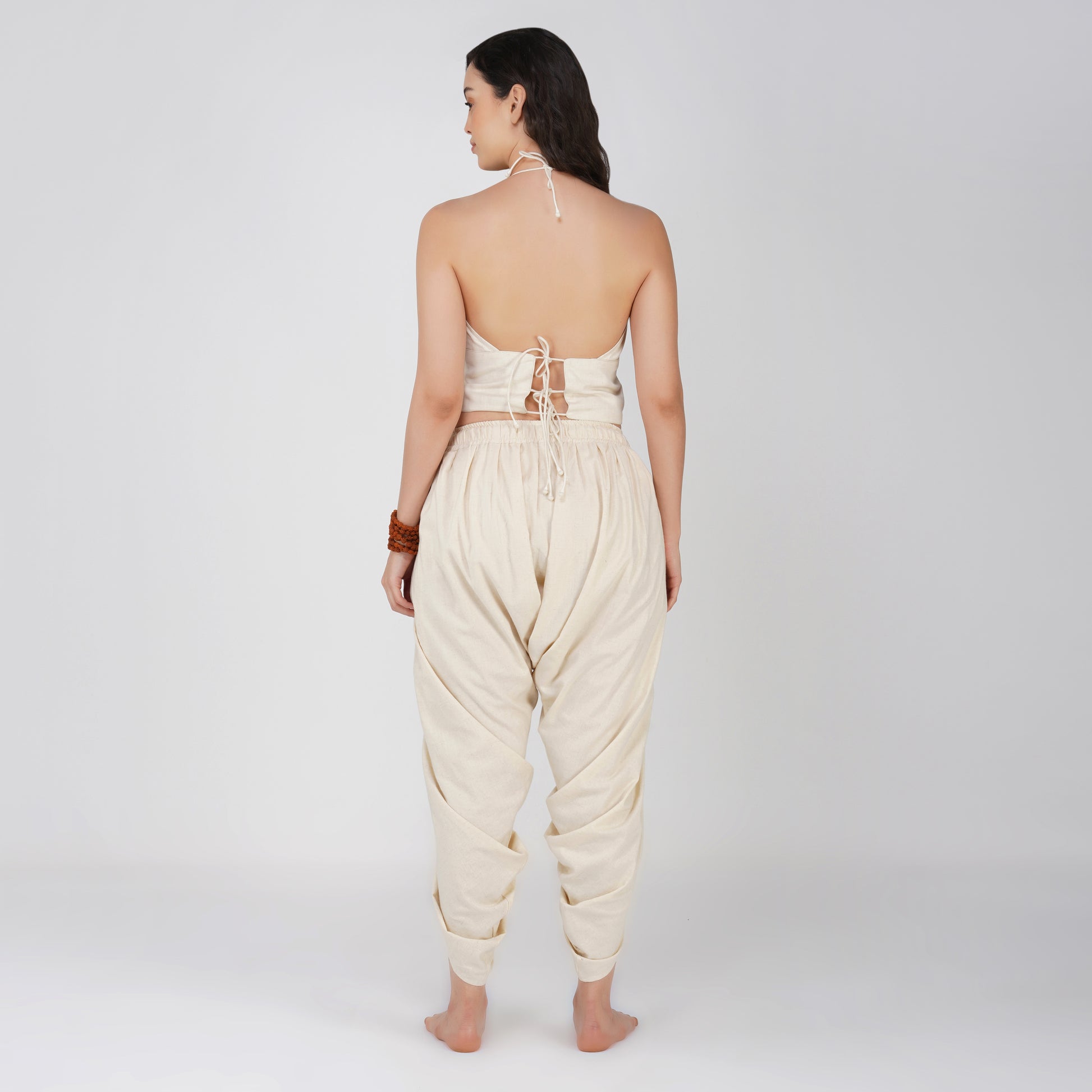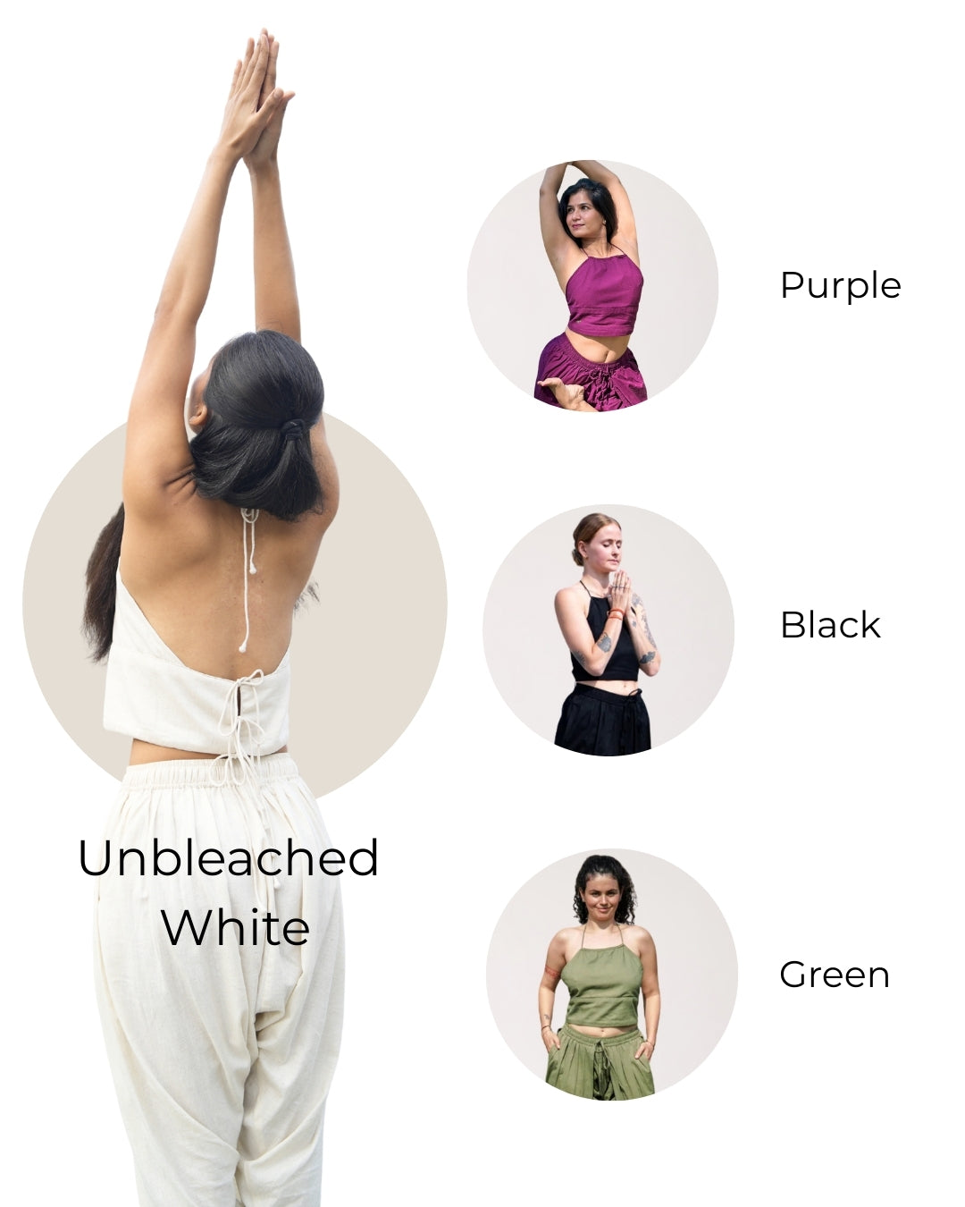 The AKASHA set is made from unbleached 100% cotton. The backless top comes with thread ties to secure it in place at the neck and back. The dhoti style pants come in a relaxed fit and with pockets, both designed to allow you to flow and move with ease.