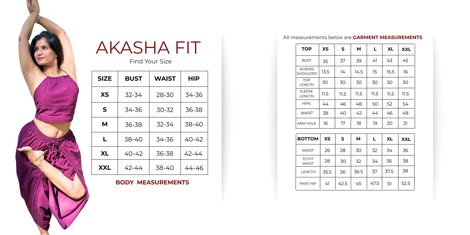 While you practice yoga the garment will need to move with you. When in doubt we encourage you to buy a size bigger for ease of movement as you do different asanas.