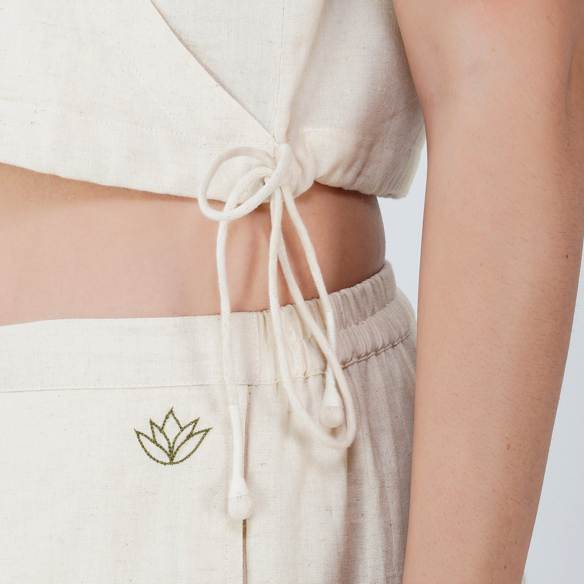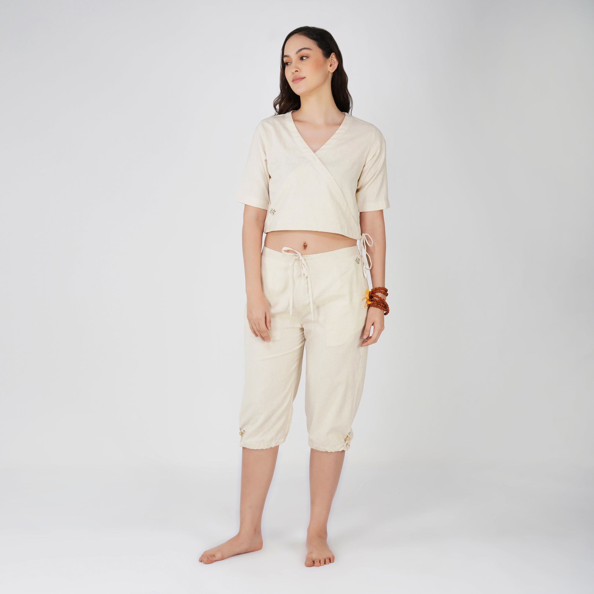 The APAS set is made from unbleached 100% cotton. Cropped at the waist, the top comes with thread tie to secure it in place. It has comfortable half sleeves and culottes with thread to secure them at the calf, both designed to allow you to flow and move with ease.