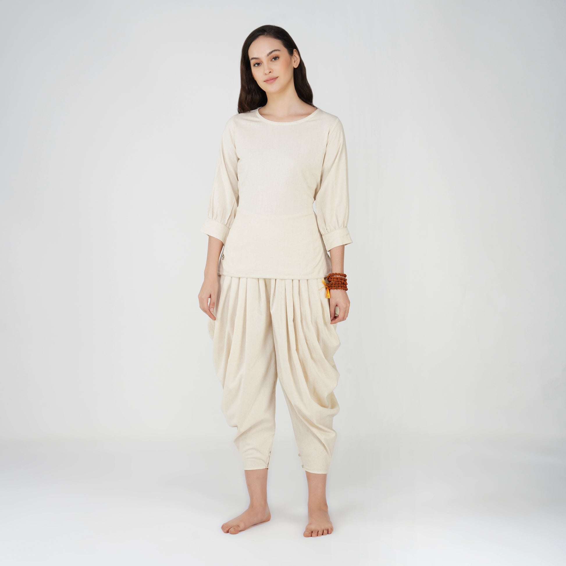 The BUDDHI set is made from unbleached 100% cotton. The kurta style 3/4th sleeved long top comes with belt to secure it in place at the waist. A different take on the traditional India dhoti the pants come in a relaxed fit and with pockets, both designed to allow you to flow and move with ease.
