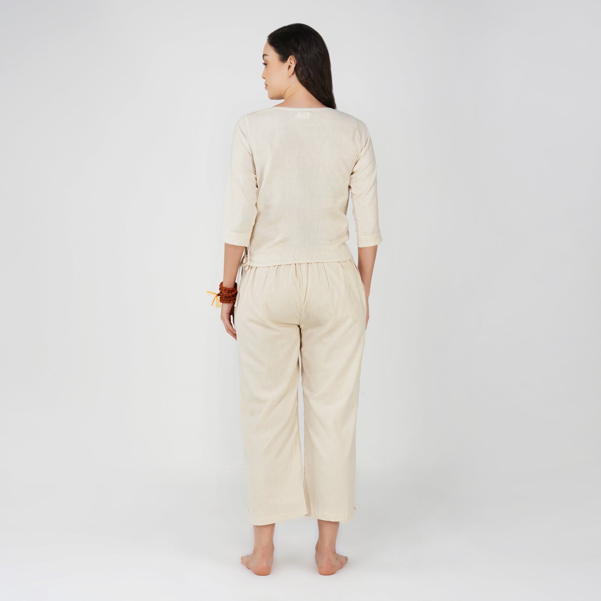 Our tops and pants for women, come with fastenings like drawstrings, wooden beads, buttons and tie ups, that prevent them from riding up during inversions or challenging poses, giving you comfort during practice.