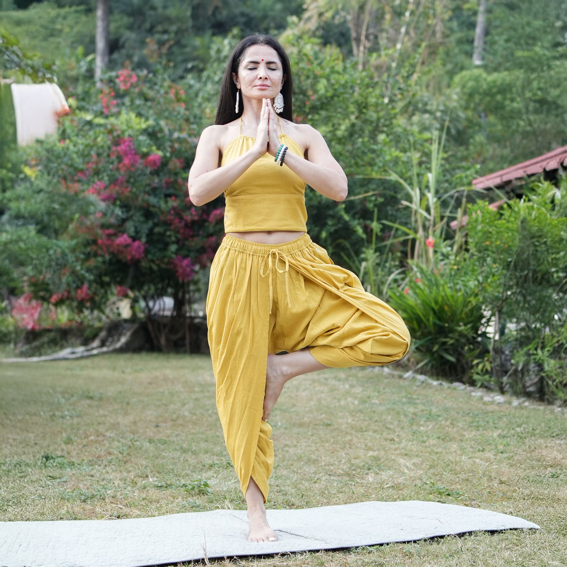 Our tops and pants for women, come with fastenings like drawstrings, wooden beads, buttons and tie ups, that prevent them from riding up during inversions or challenging poses, giving you comfort during practice.